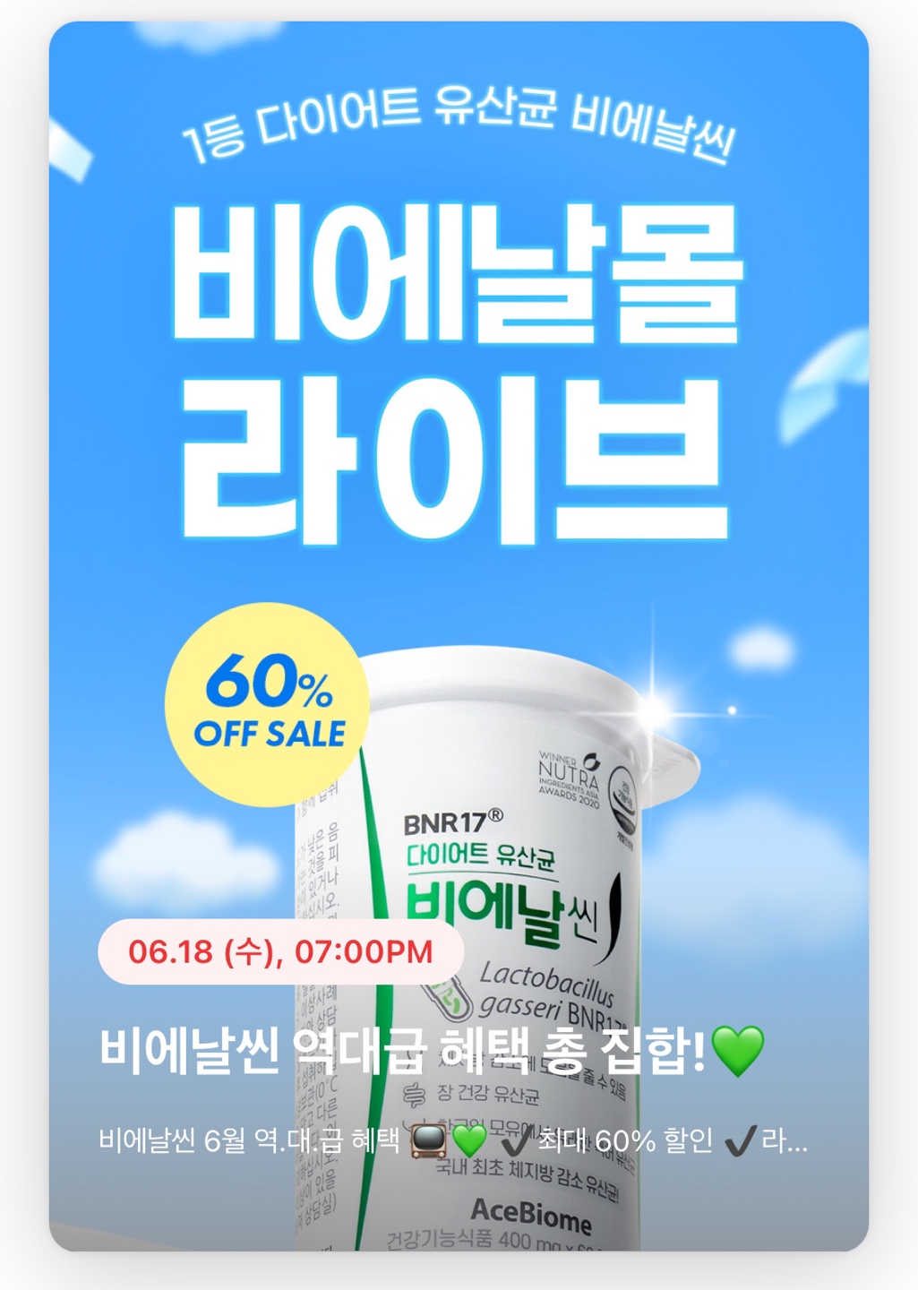 [라이브] 다이어트 유산균 비에날씬 최대 60% 라이브 할인 중
