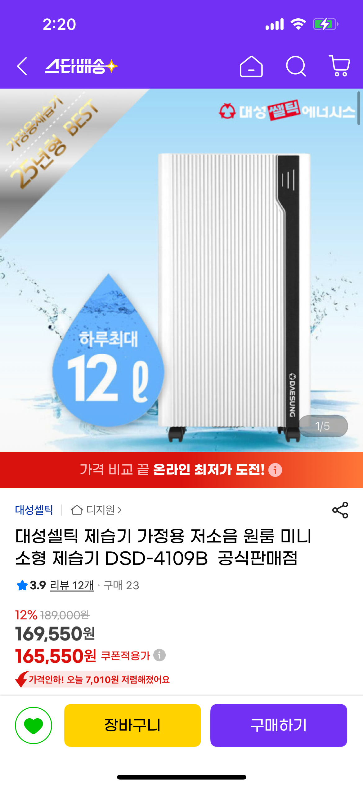 [지마켓] 대성셀틱 가정용 저소음 소형 제습기 (169,550원/무료) > 국내핫딜
