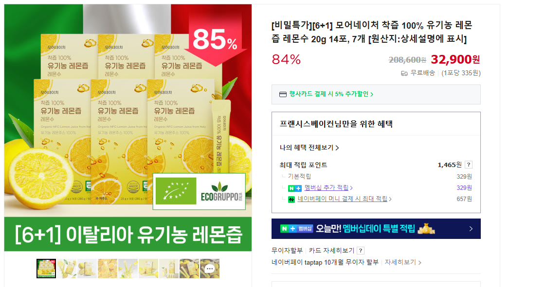 유기농 레몬즙 7박스 30,900원 가격좋네요 라운지 가입시 2000원할인까지 제공됩니다.