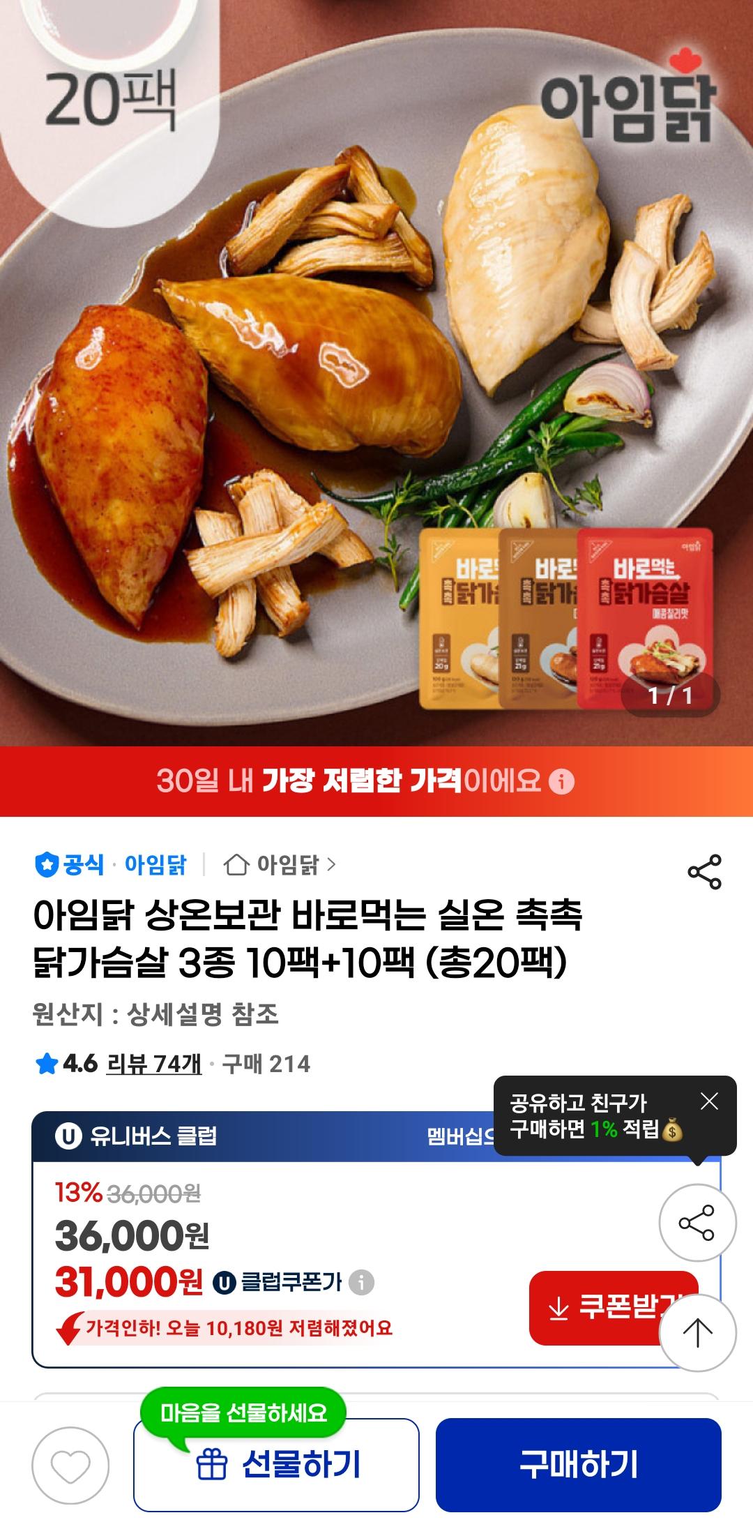 [지마켓] 아임닭 상온보관 바로먹는 실온 촉촉 닭가슴살 3종 10팩+10팩 (31,000원/무배) > 국내핫딜