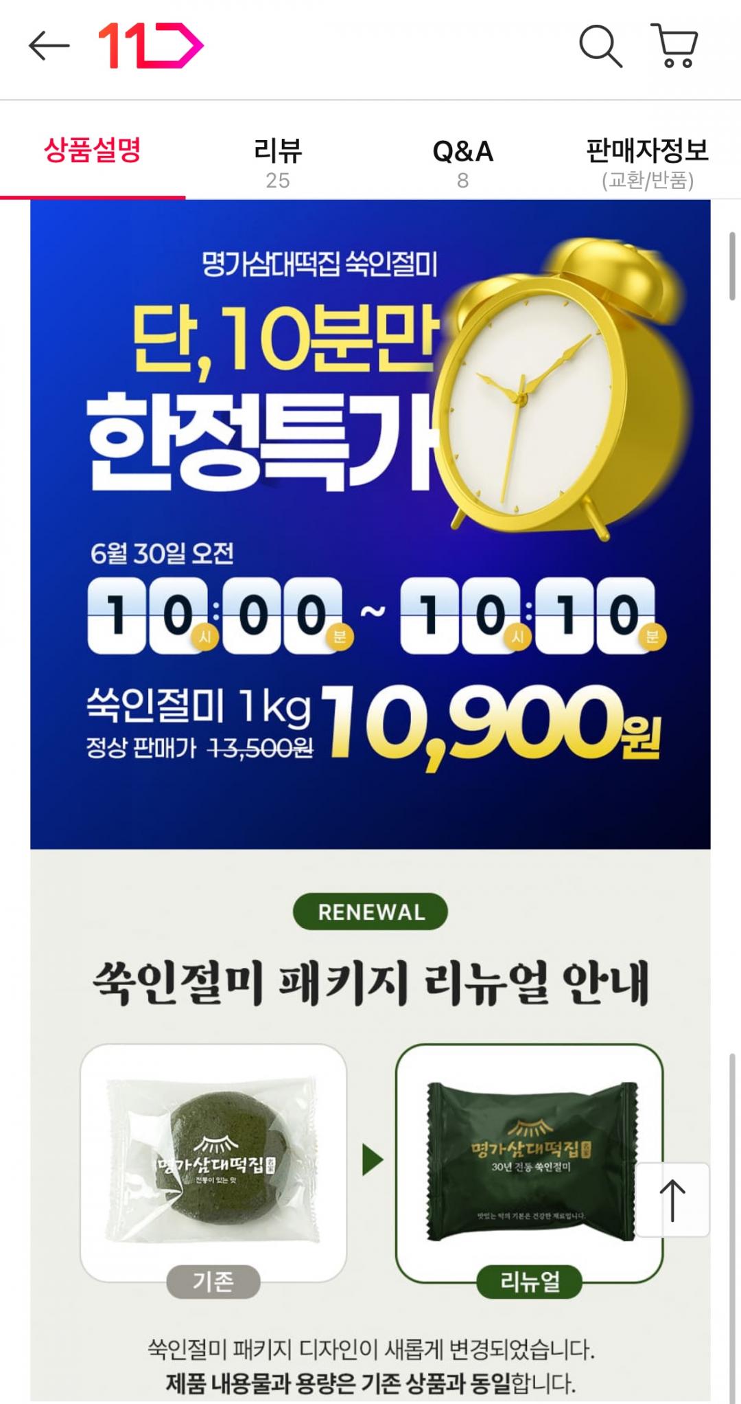 [11번가] 10분러시 명가삼대떡집 쑥인절미 개별포장 1kg (10,900원/무료) > 국내핫딜