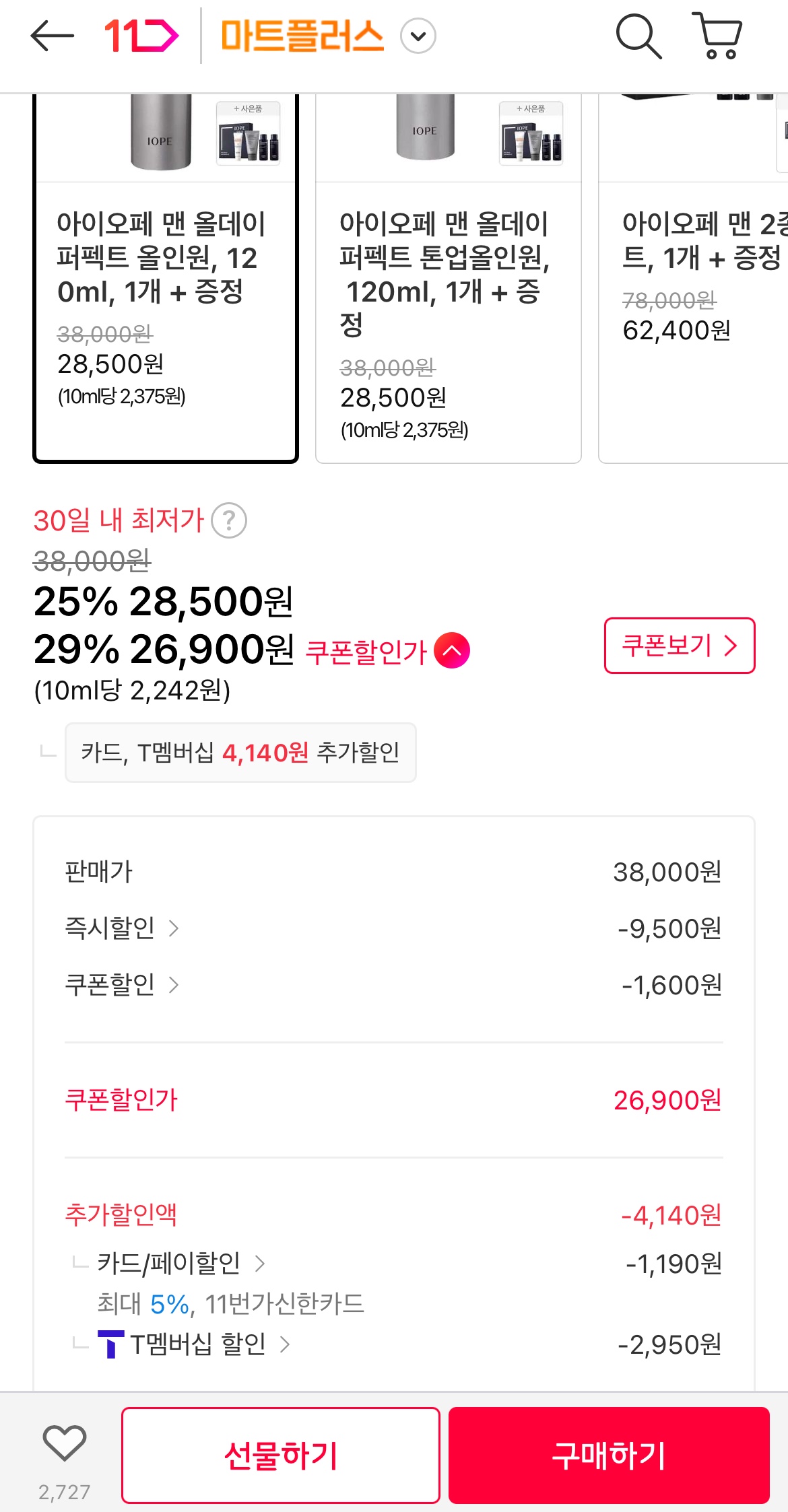 쿠폰할인받으면 26,900원나오고 카드랑 티멤 추가할인가능합니다