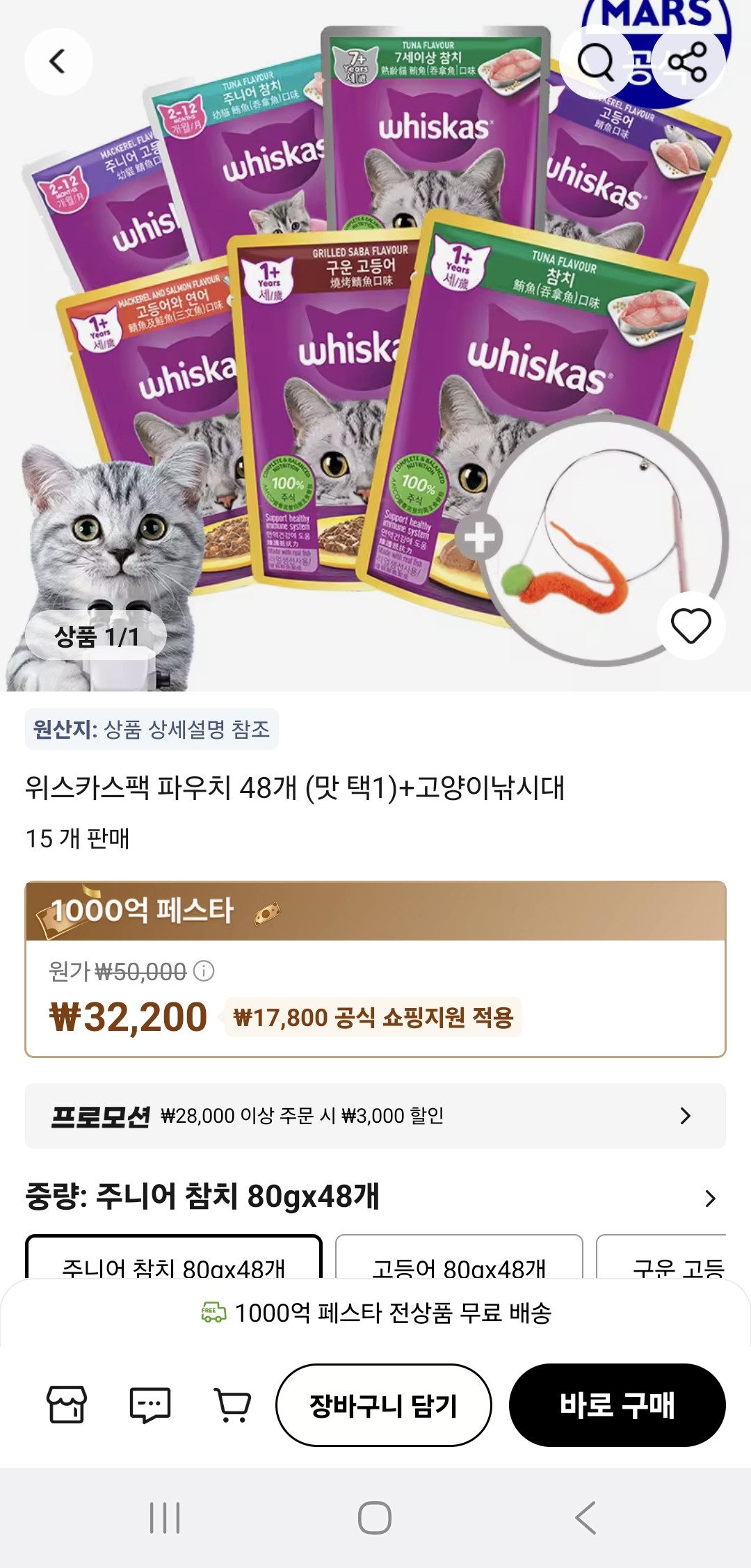 고양이들 잘 먹는 생선 파우치고 맛 다양하게 있으니 그 중 1가지 선택 할 수 있어요