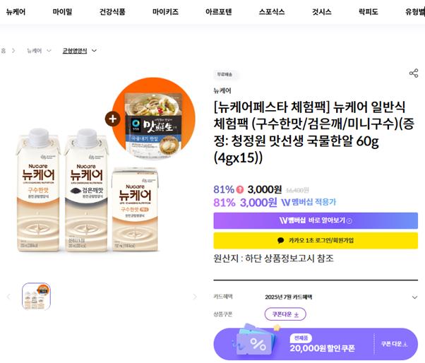 (대상WL)뉴케어 뉴케어 일반식 체험팩 (구수한맛/검은깨/미니구수) 3,000원+코인육수 > 국내핫딜