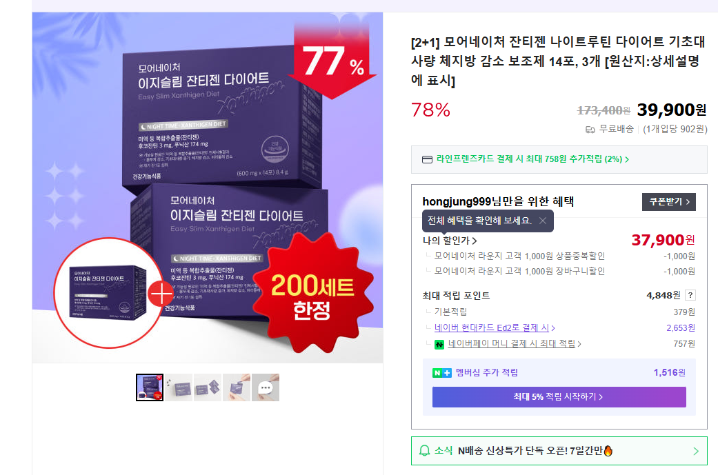 [네이버] 이지슬림 잔티젠 다이어트 14포*3개 (37,900원/무료)