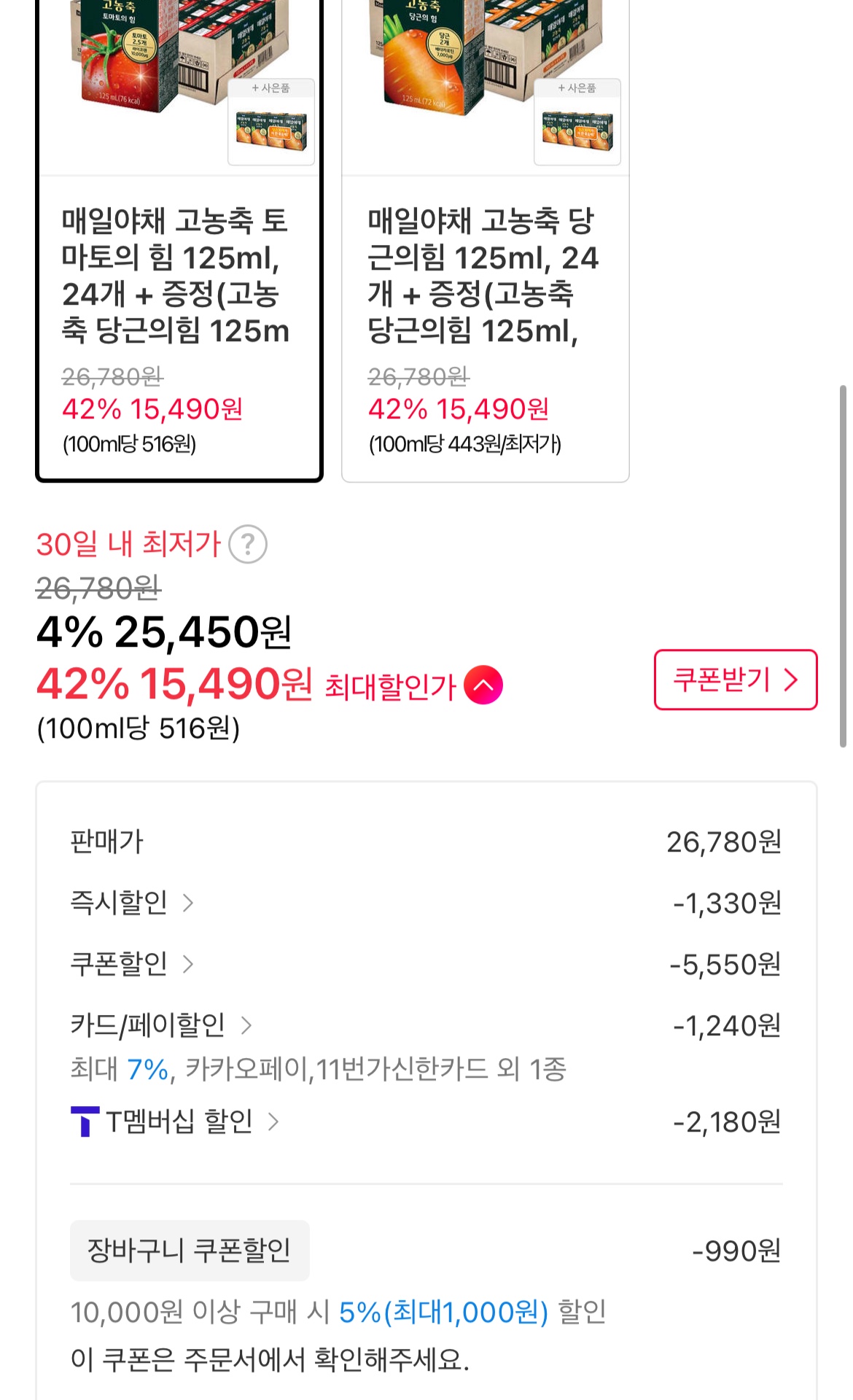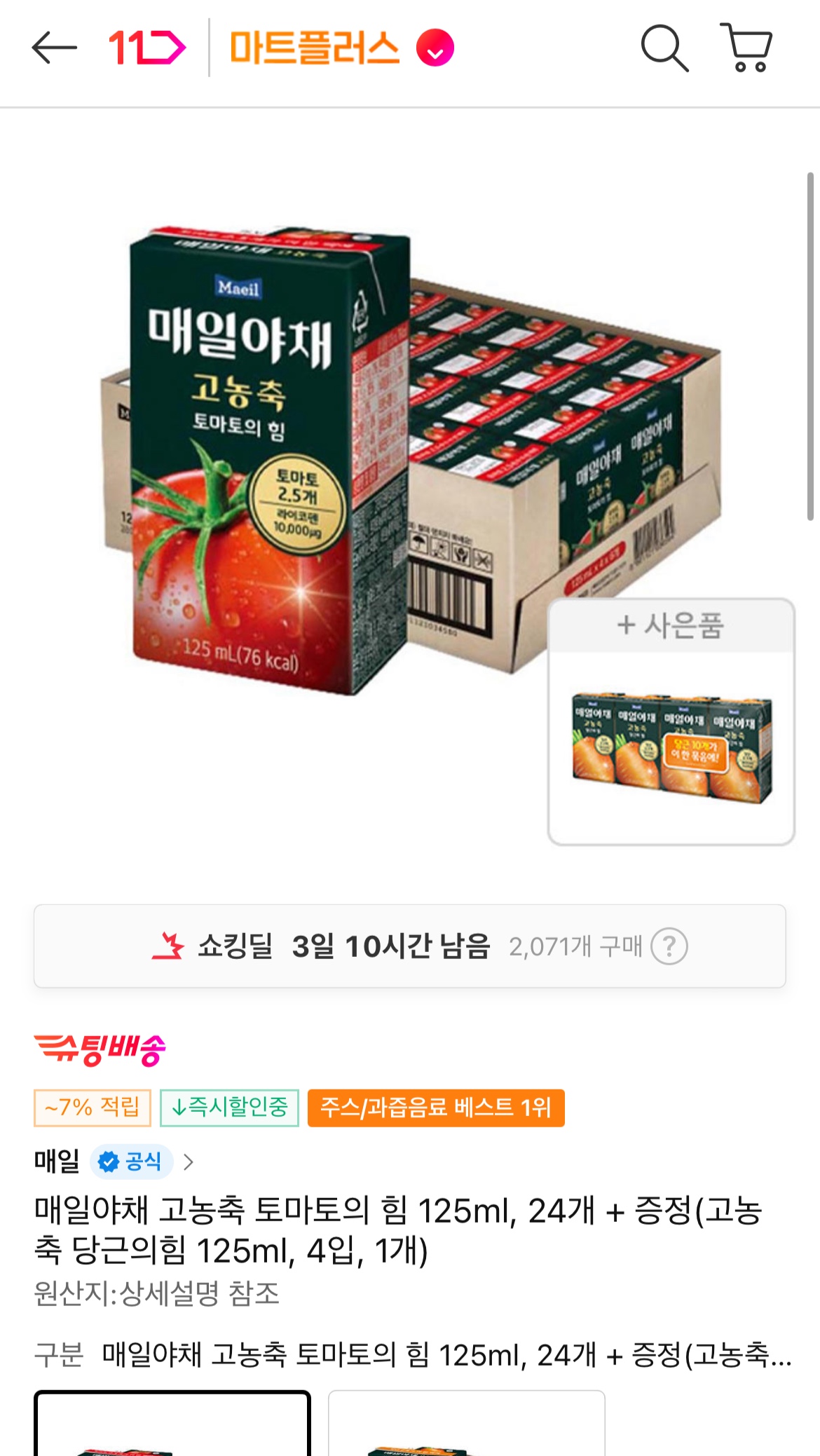 [11번가] 매일야채 고농축 토마토의 힘 125ml 24개+증정 (15,490원/무료)