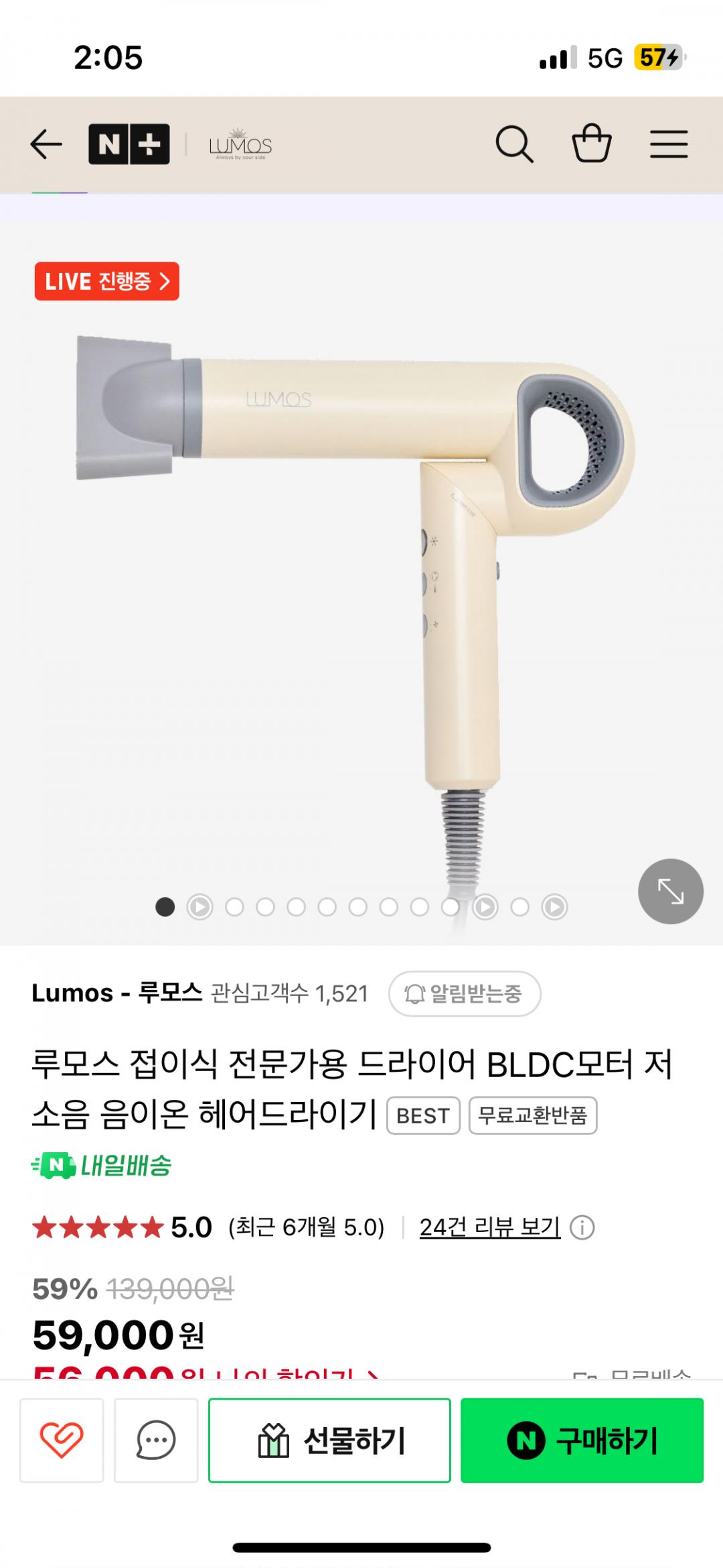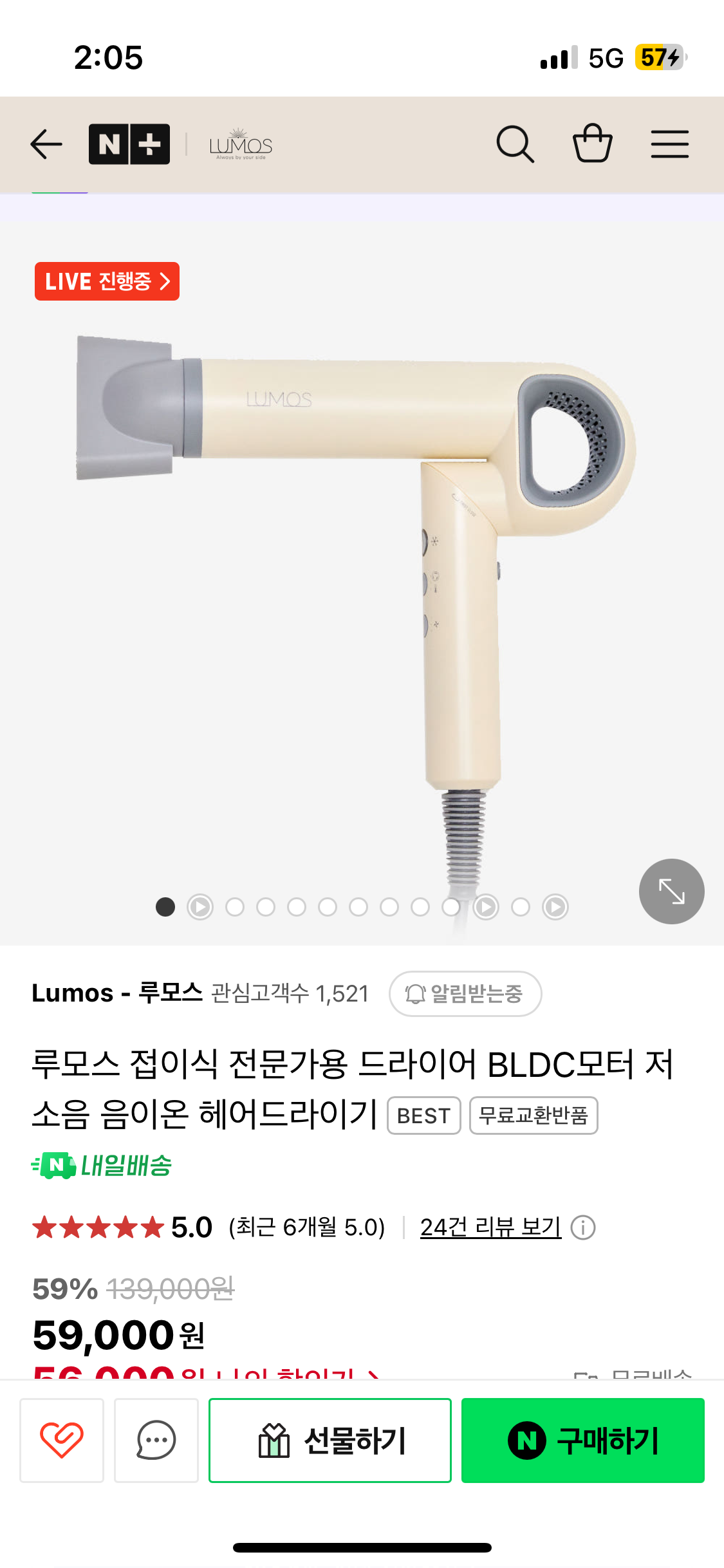 [네이버] 루모스 접이식 전문가용 드라이어 BLDC모터 저소음 음이온 헤어드라이기 (48,200원/무료)