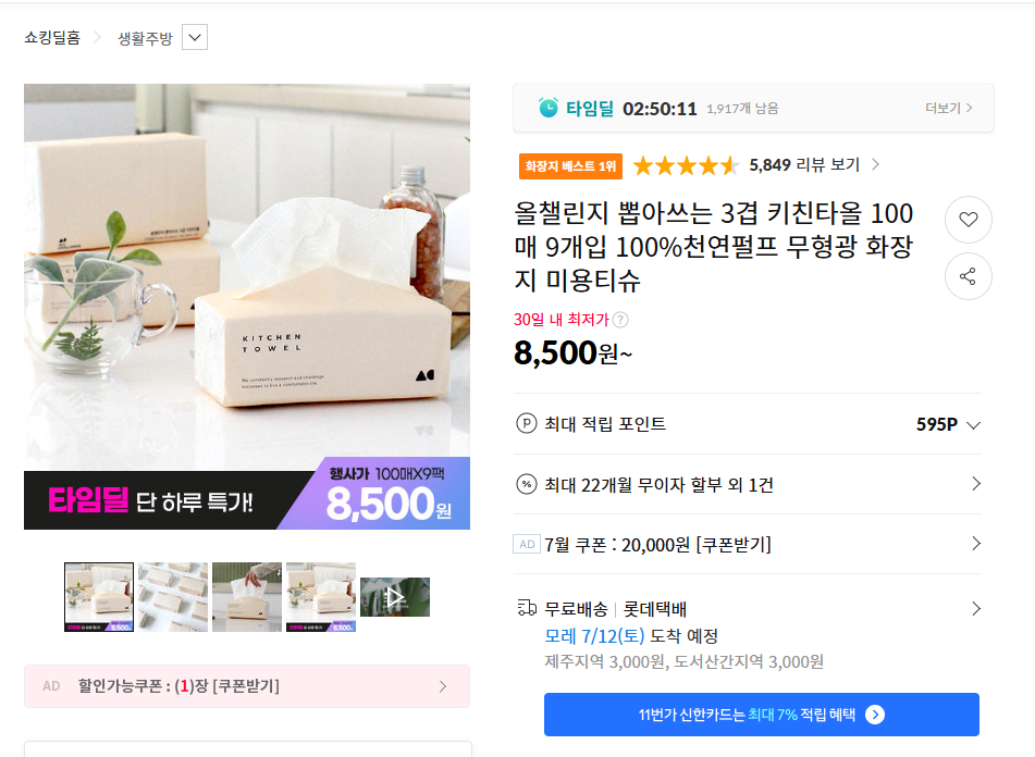 옵션에 있는 다른 키친타올이나 미용티슈도 만원은 안넘습니다.​