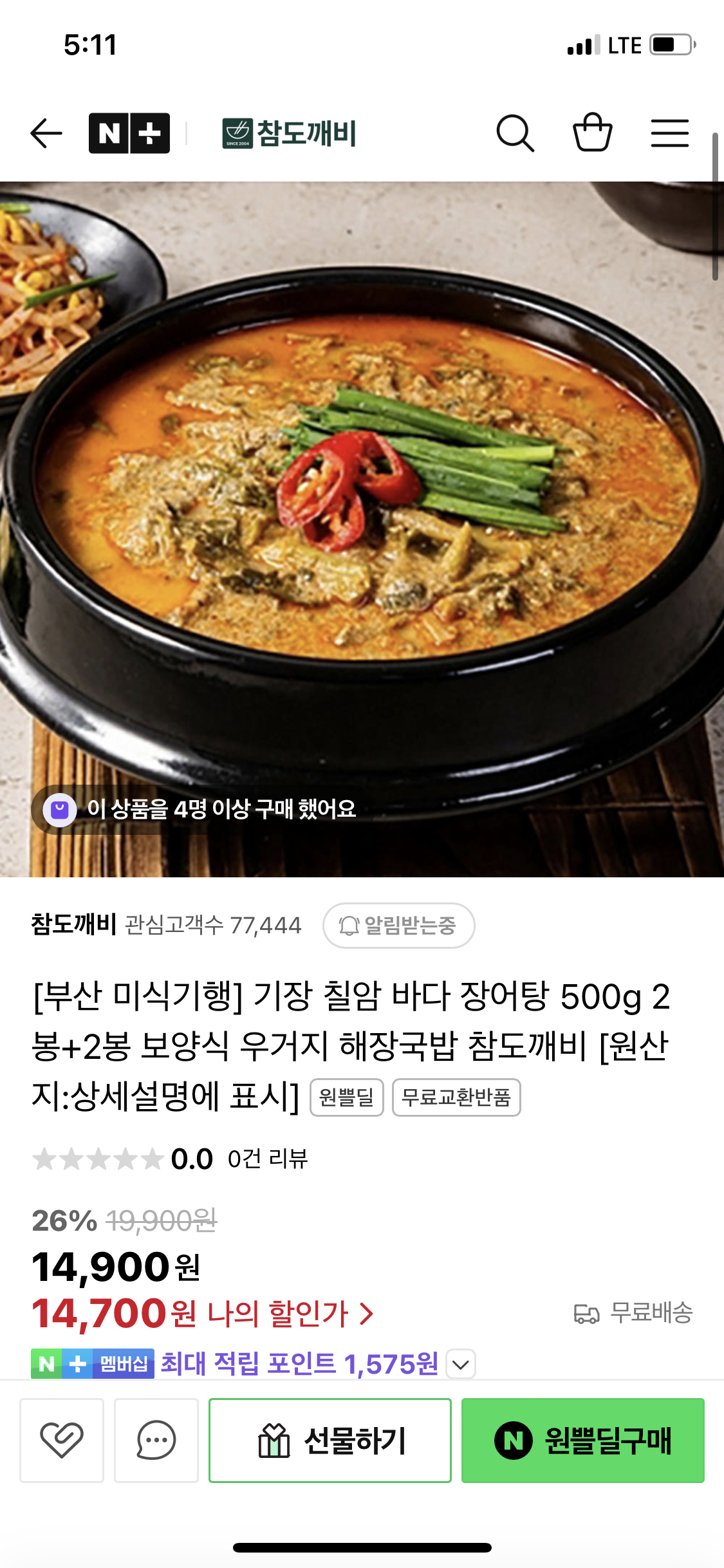 [네이버] 칠암 바다 장어탕 500g 2봉+2봉 (14700원/무배) > 국내핫딜