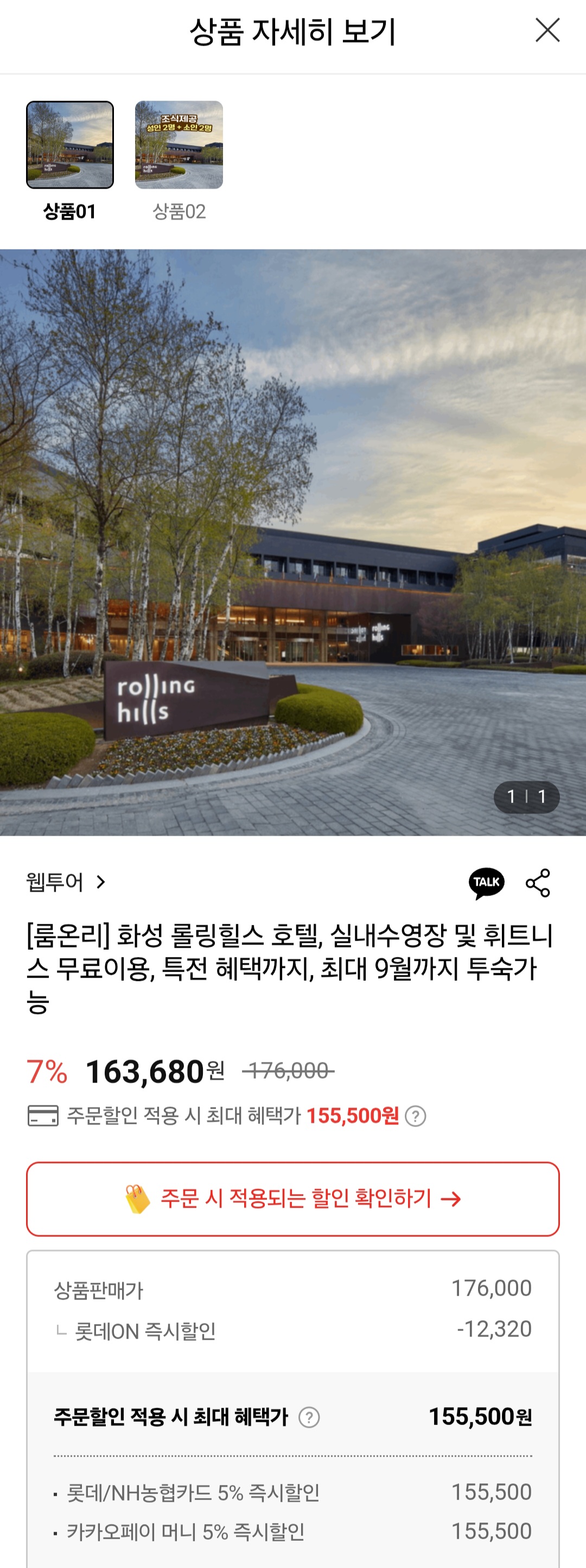 [롯데온] 화성 롤링힐스 호텔 룸온리 (155,500원/무료) > 국내핫딜