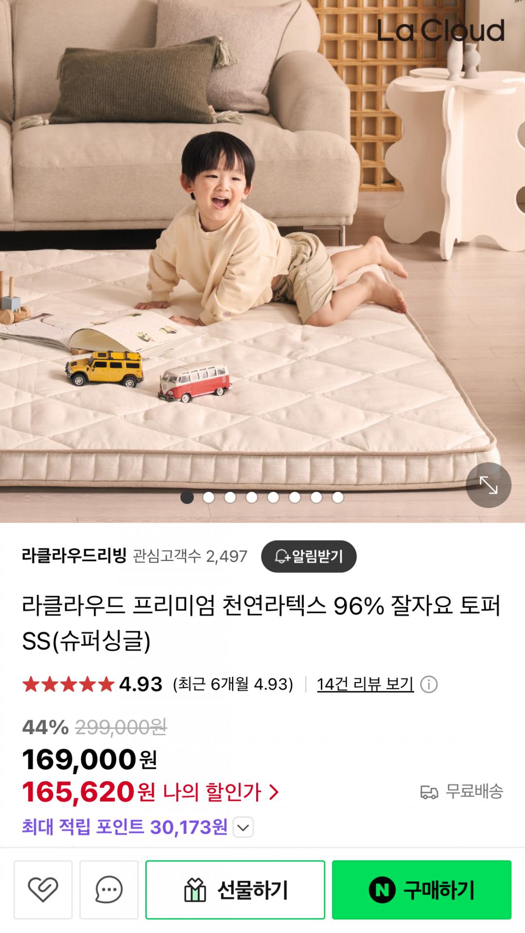[네이버] 라클라우드 천연라텍스 토퍼 슈퍼싱글 (165,620원/무배)