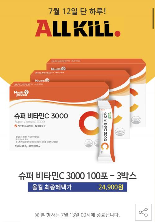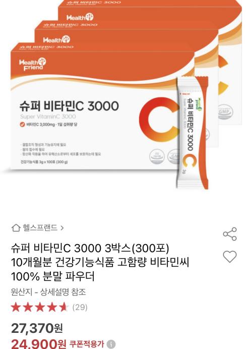 [옥션] 슈퍼 비타민C 3000 3박스(300포) 10개월분 (24,900원/무배) > 국내핫딜