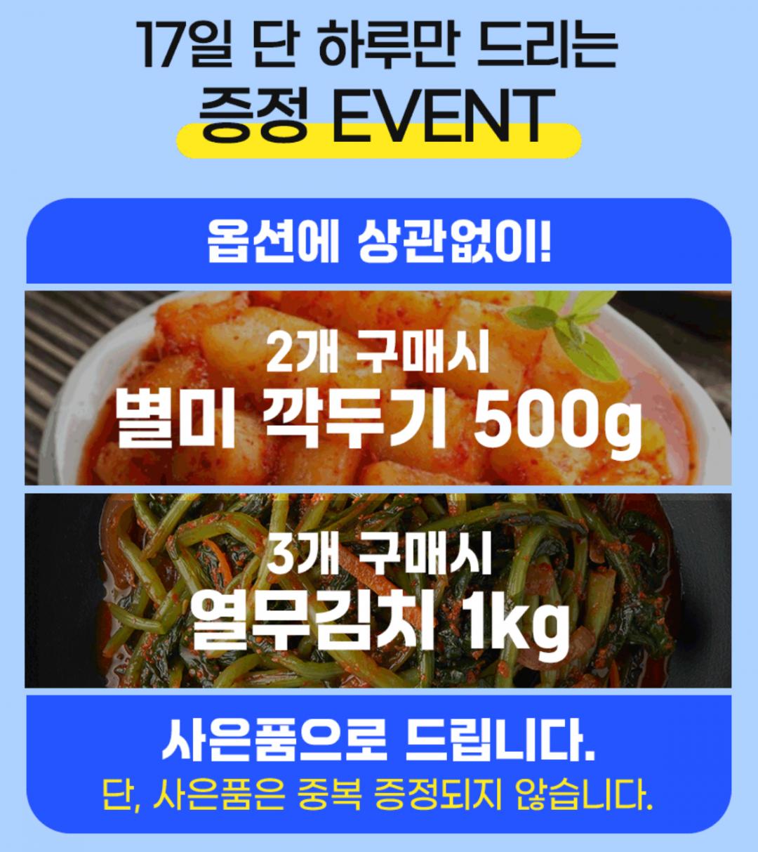 2개 구매시 깍두기 / 3개 구매시 열무김치 1kg