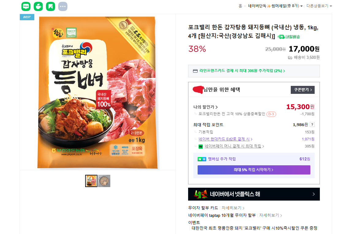 [네이버] 포크밸리 한돈 감자탕용 돼지등뼈 1kg 4개 (15,300원 / 네멤무료) > 국내핫딜