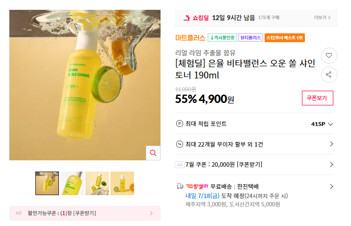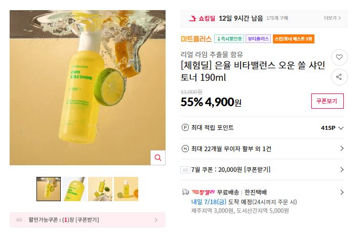 [11번가] 은율 비타밸런스 토너 190ml 체험딜 (4,900원 / 무료)