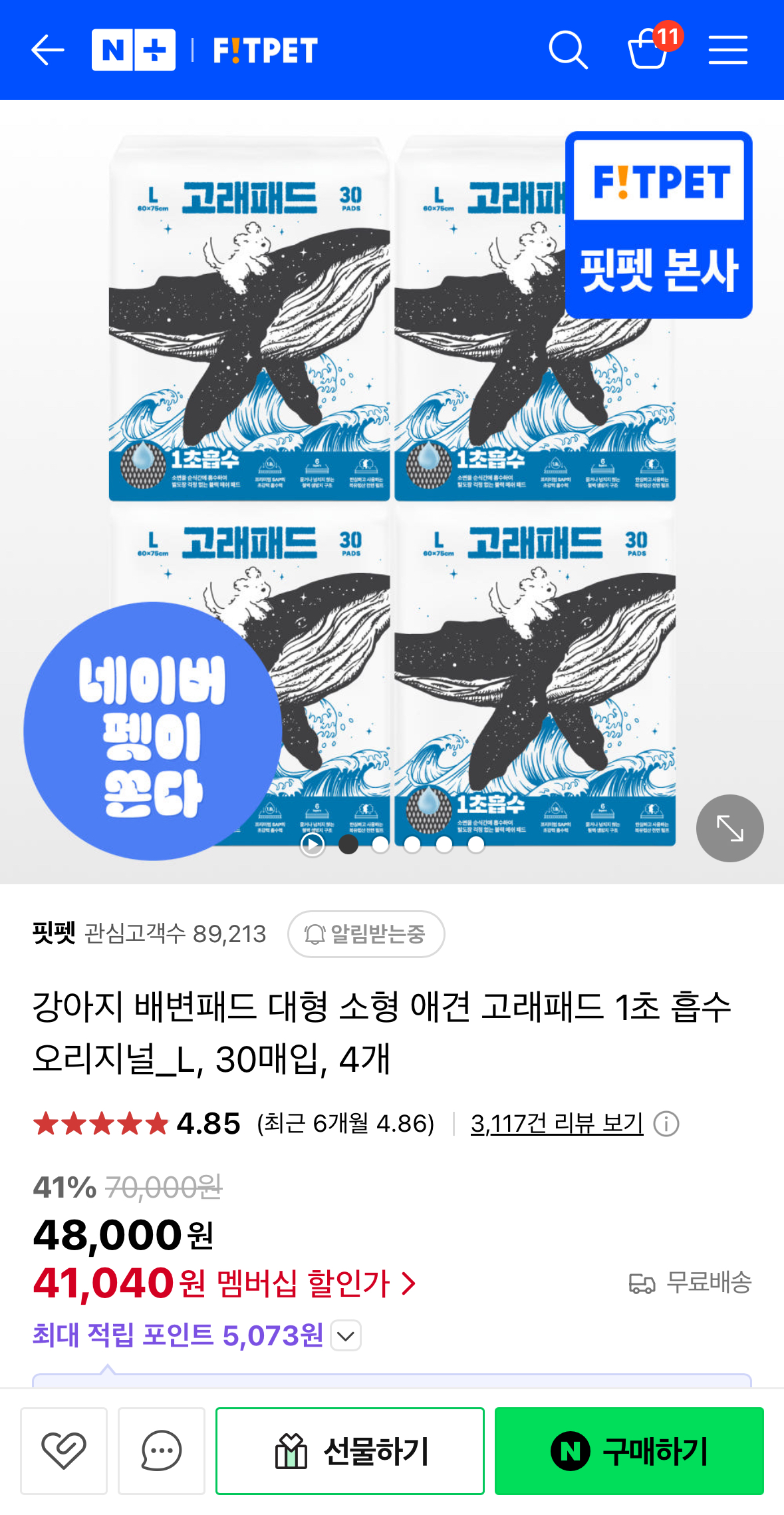 [네이버] 고래패드 강아지 배변패드 대형 (41,040원/무배) > 국내핫딜