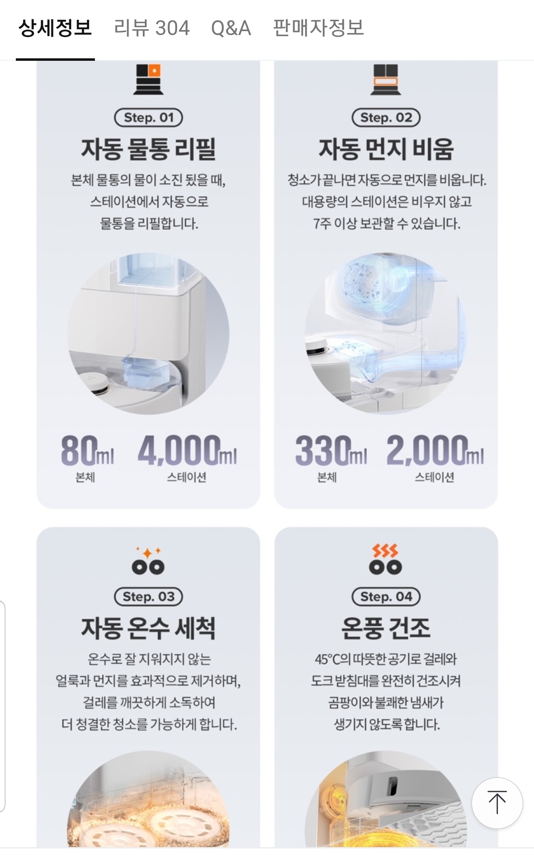 흡입력 7,000pa,자동 물통 리필,자동 먼지 비움,스마트 오염 감지,자동 온수 세척,온풍 건조 다 가능합니다.