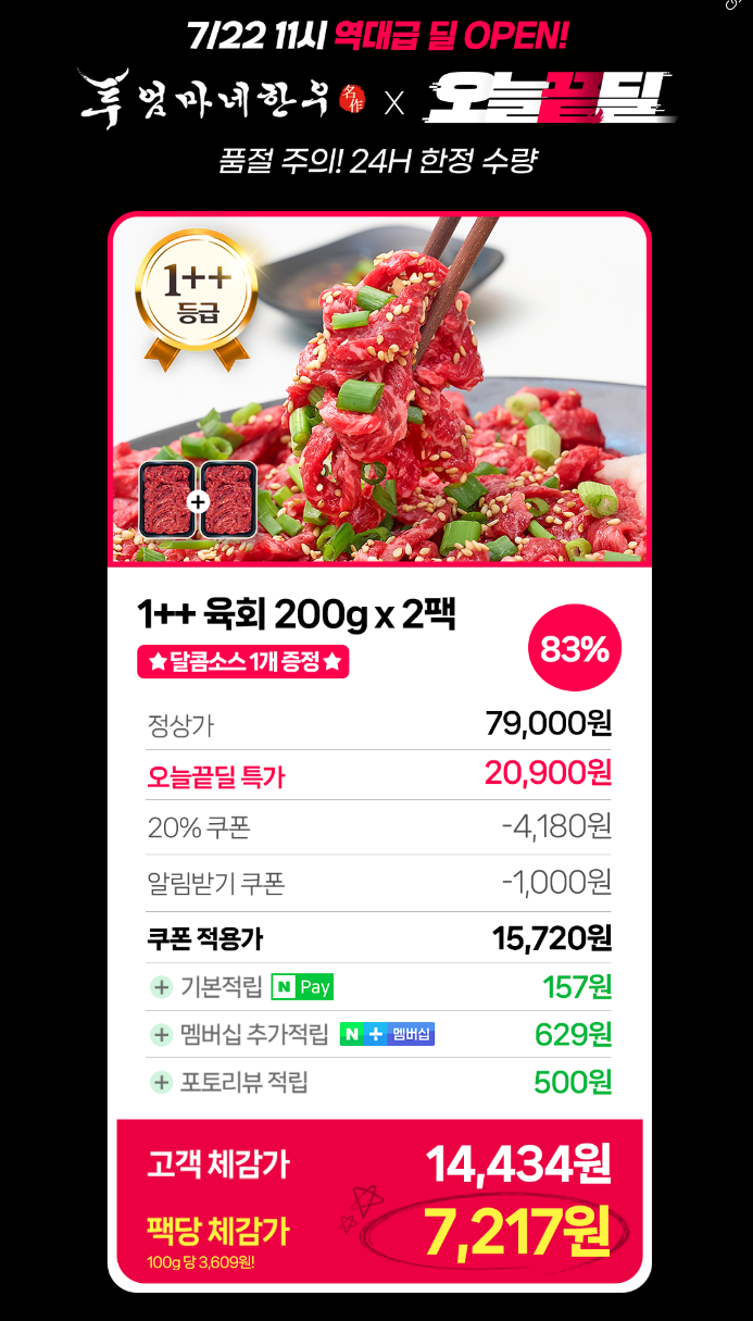 [네이버] 1++등급 엄마네한우 육회 400g + 소스 (15,720원 / 무료)