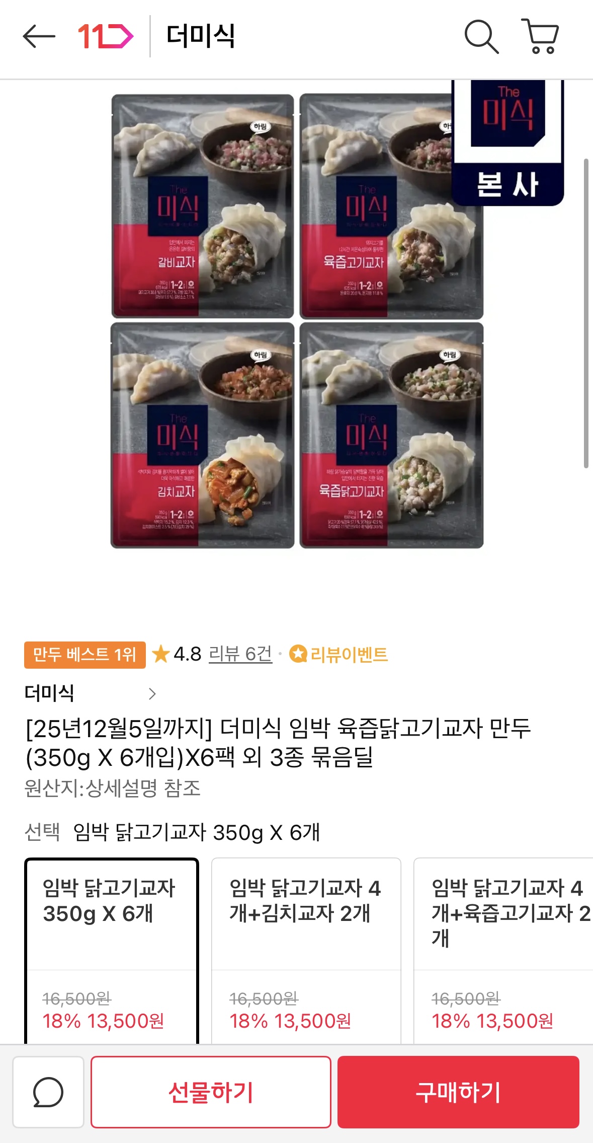 [11번가] 더미식 닭고기교자 만두 (350g x 6개입) 6팩 (13,500원/무료) > 국내핫딜