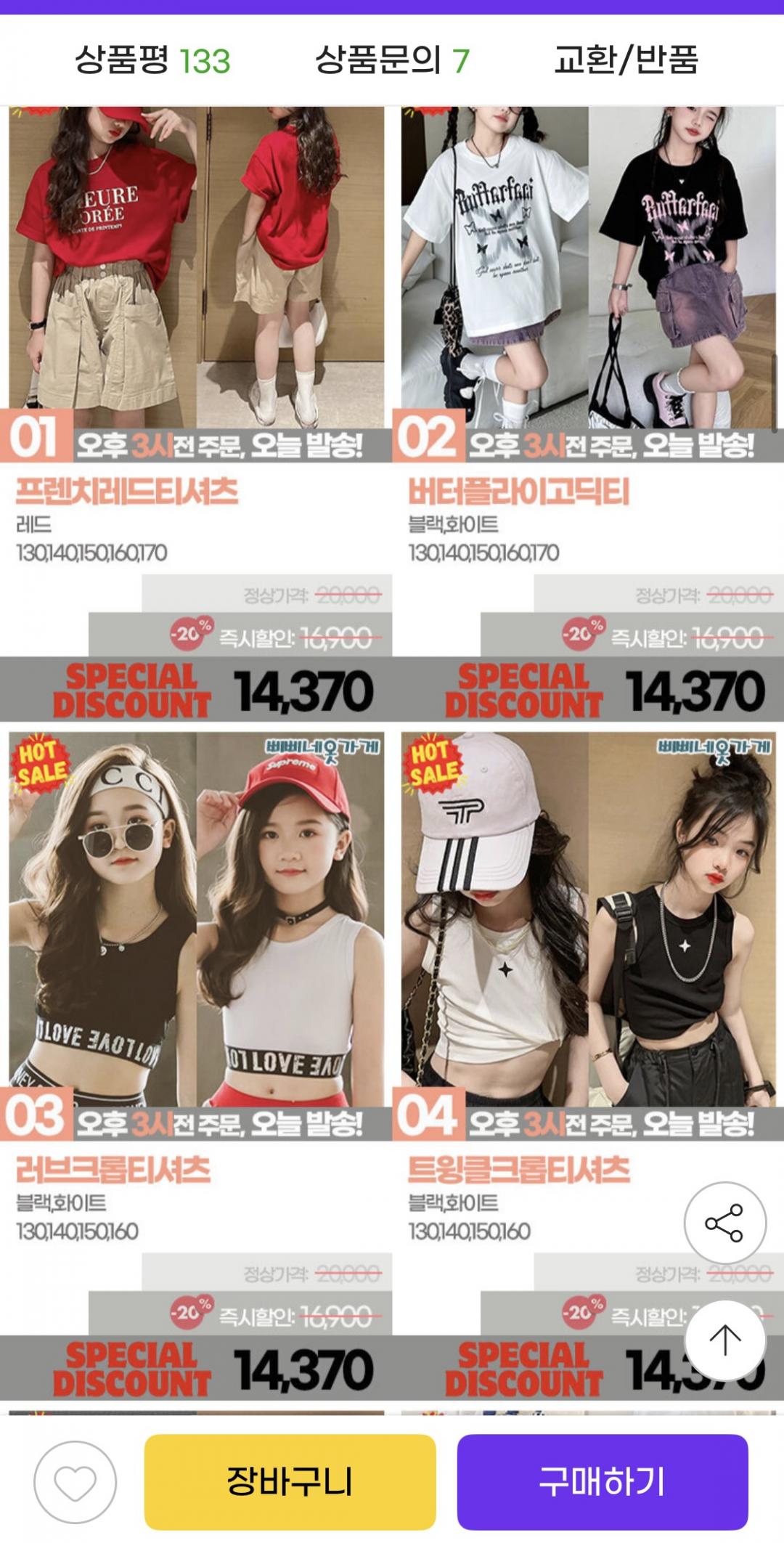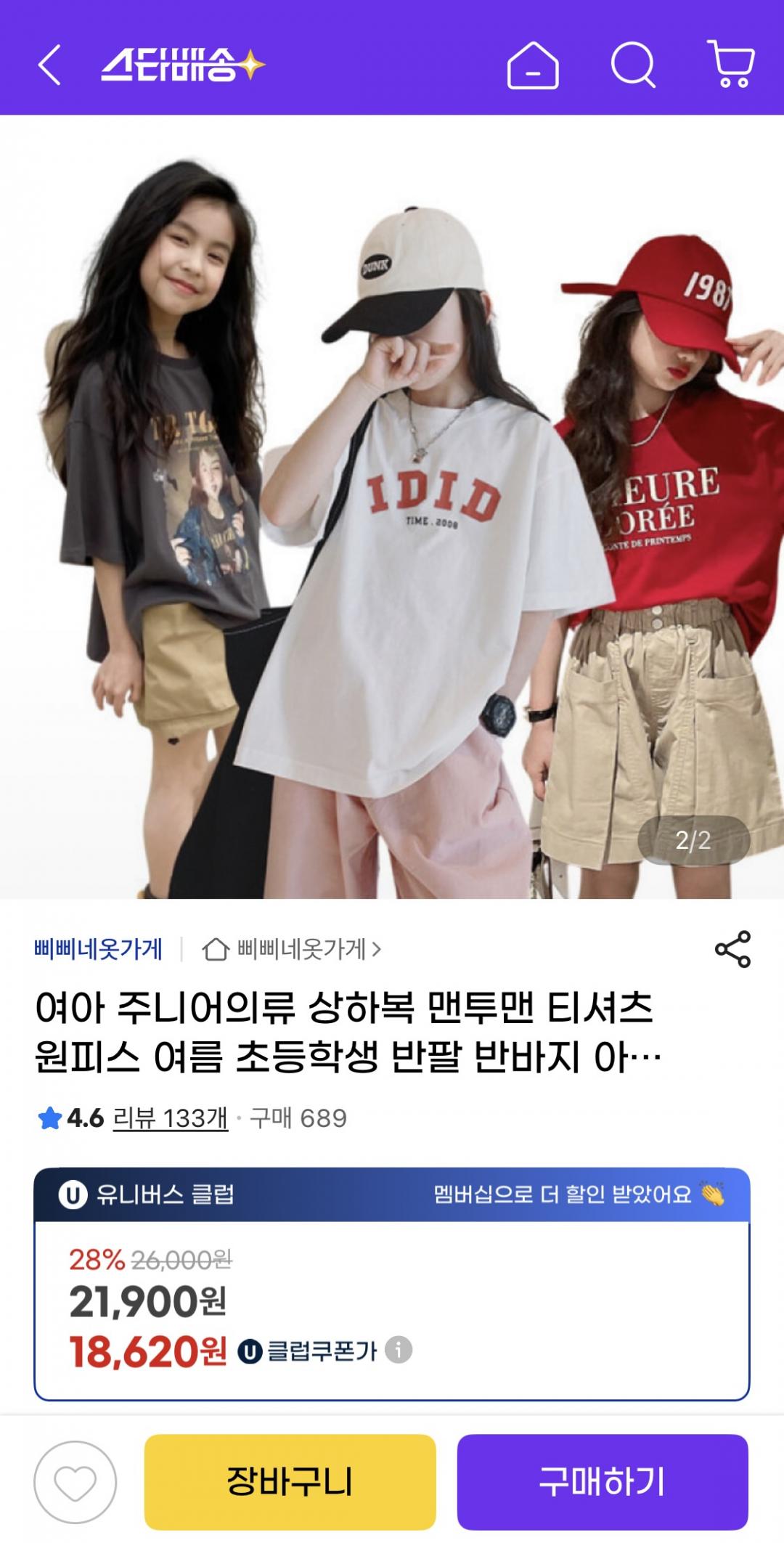 티셔츠, 크롭 티셔츠, 반바지, 원피스, 상하 셋업 등 다양하게 있는데