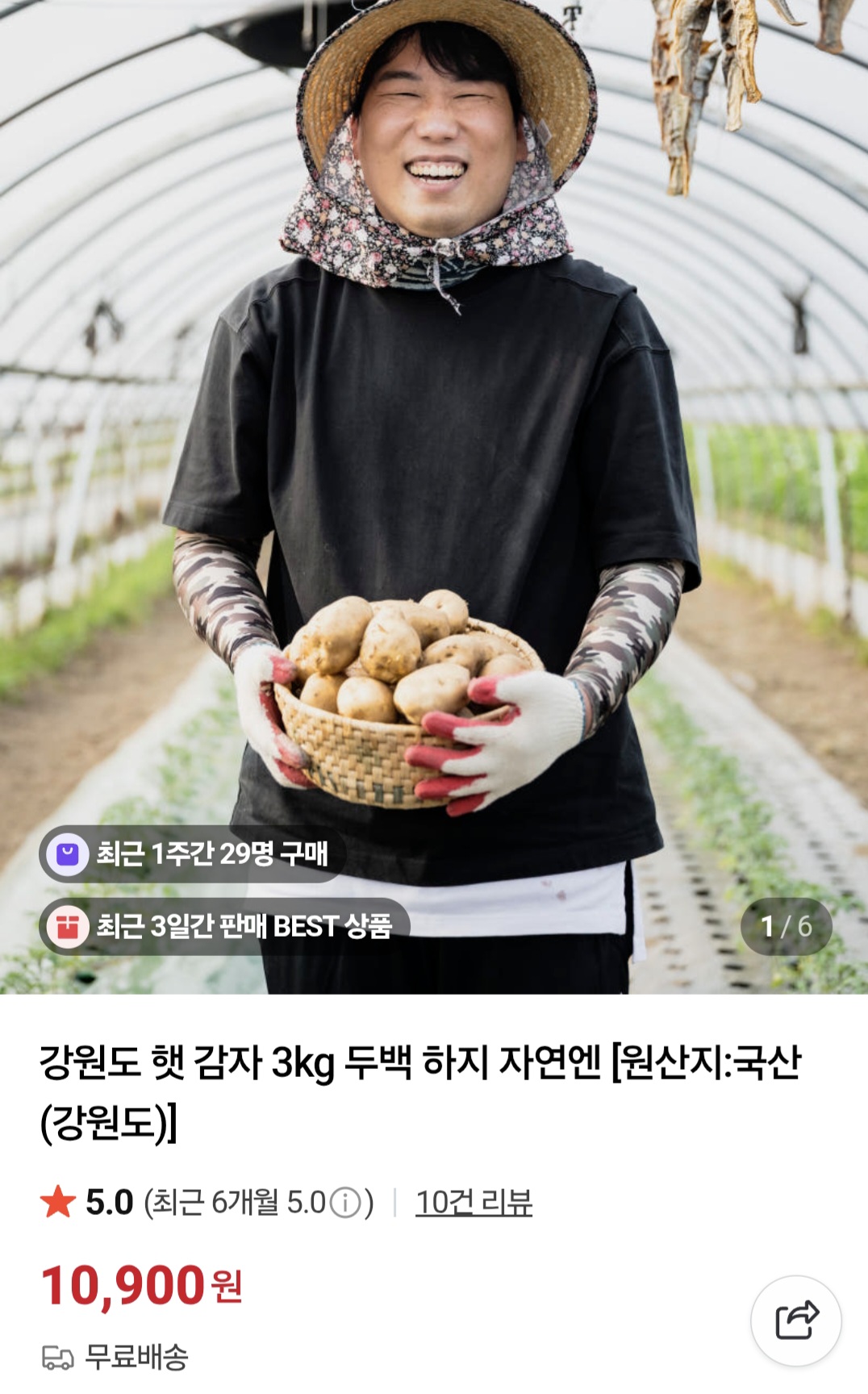 [네이버] 강원도 햇감자 3kg (중~왕왕사이즈 선택) (10,900원/무료) > 국내핫딜
