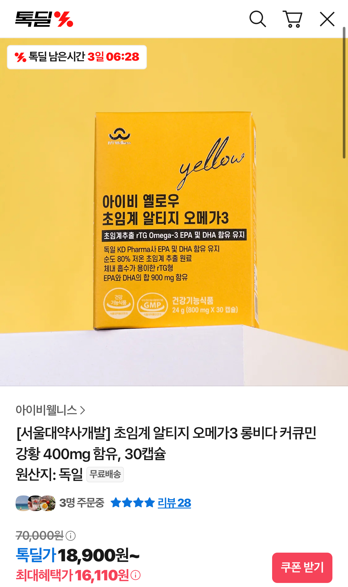 [카카오] 초임계 알티지 오메가3 롱비다 커큐민 강황 400mg 함유, 30캡슐 (16,110원/무배) > 국내핫딜