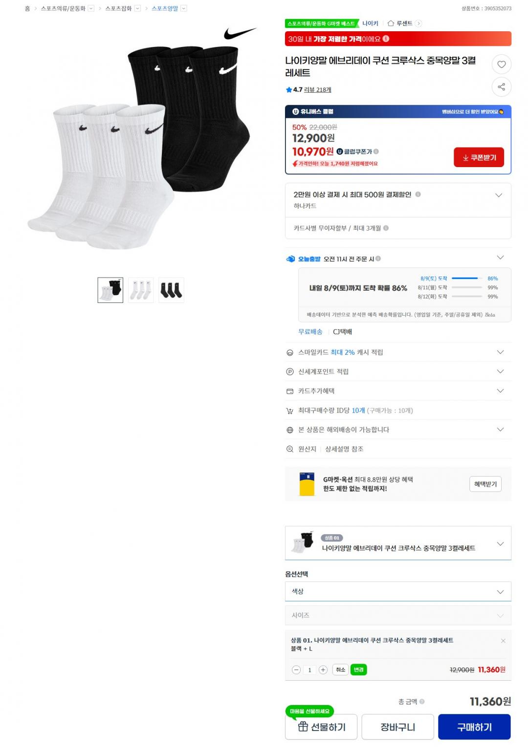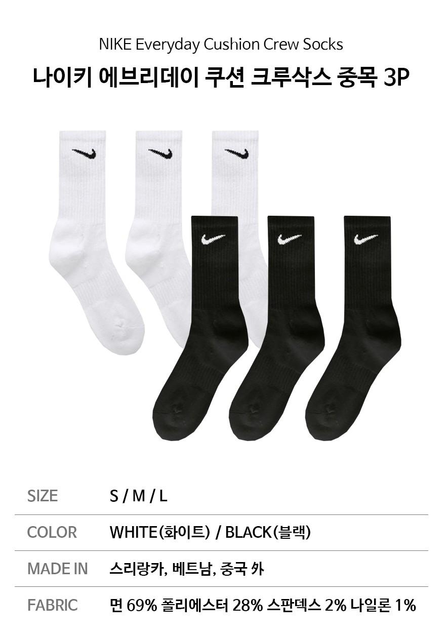 [지마켓] 나이키양말 에브리데이 쿠션 크루삭스 중목양말 3켤레 세트 (11,360원/무배)