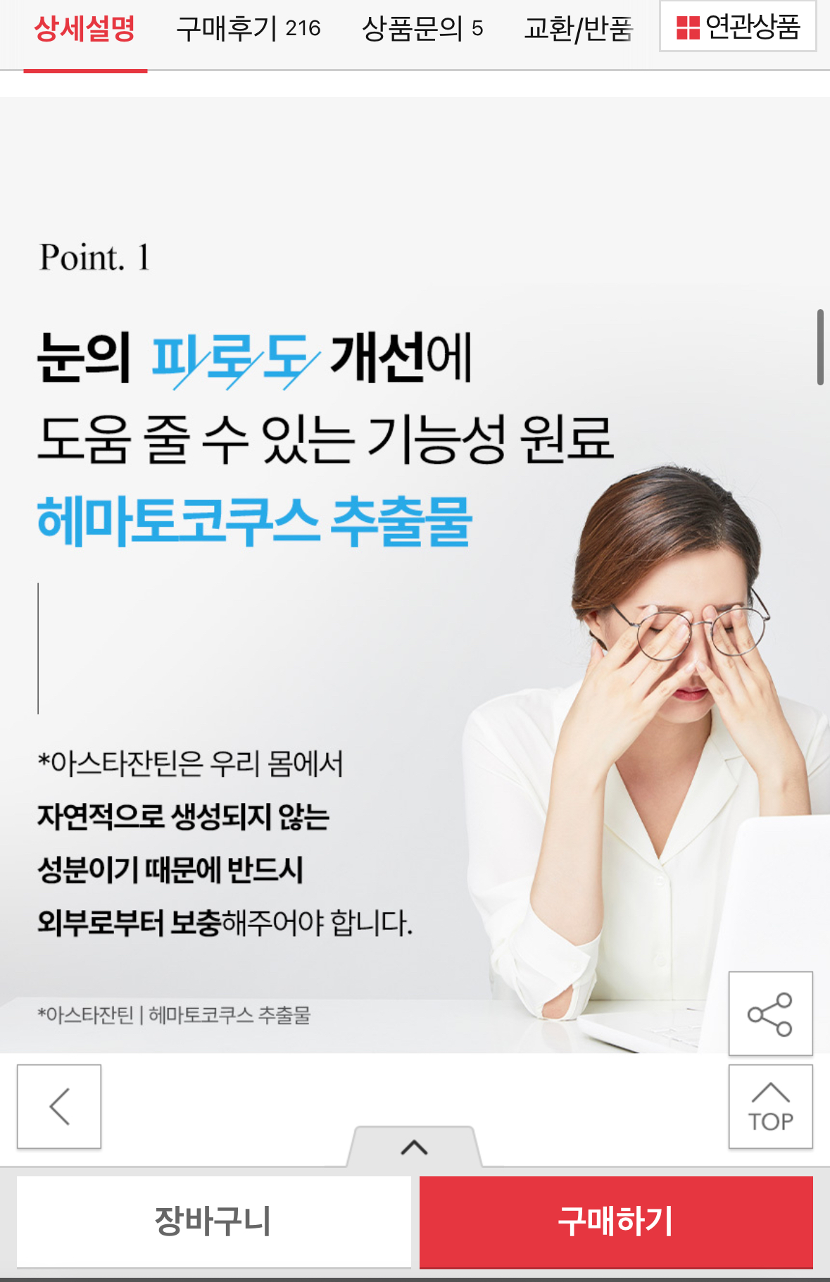 눈 피로 개선에 도움 준다는 아스타잔틴(헤마토코쿠스 추출물) 들어있고