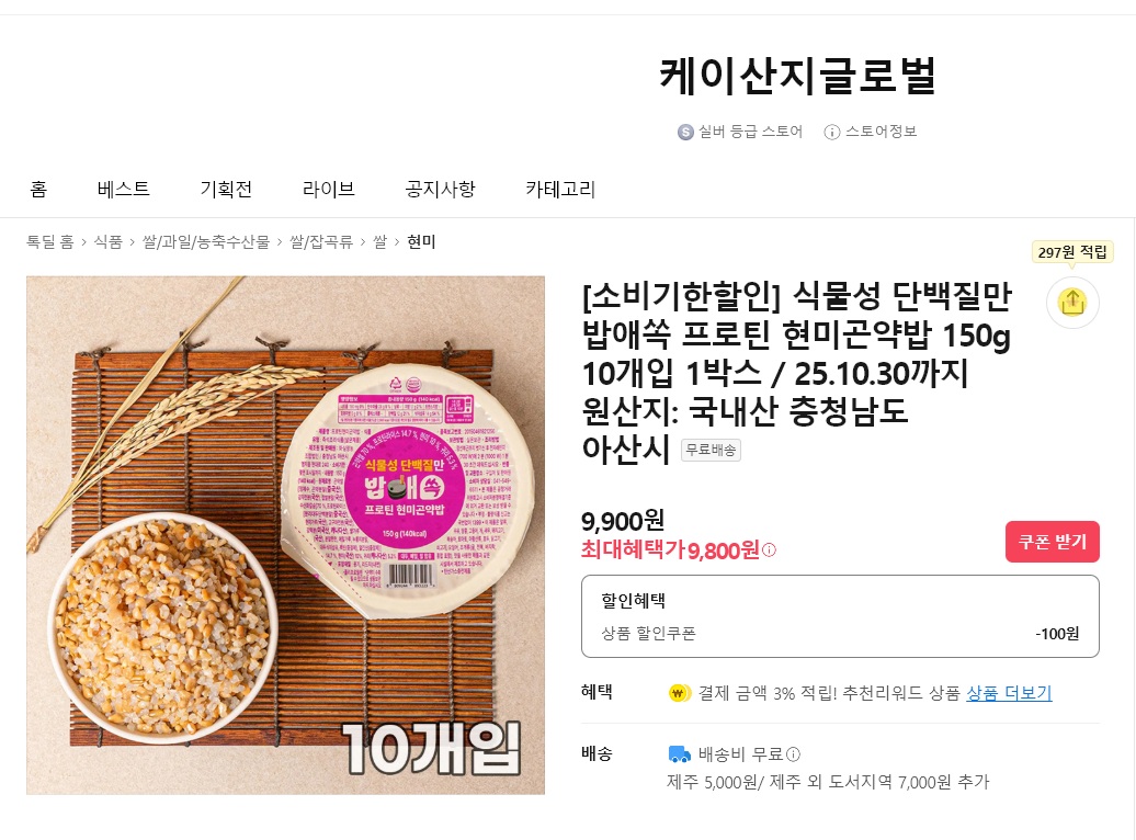 [카카오톡딜] (소비기한할인) 식물성 단백질만 밥애쏙 프로틴 현미곤약밥 150g 10개입 1박스 (9,900원/무료배송) > 국내핫딜