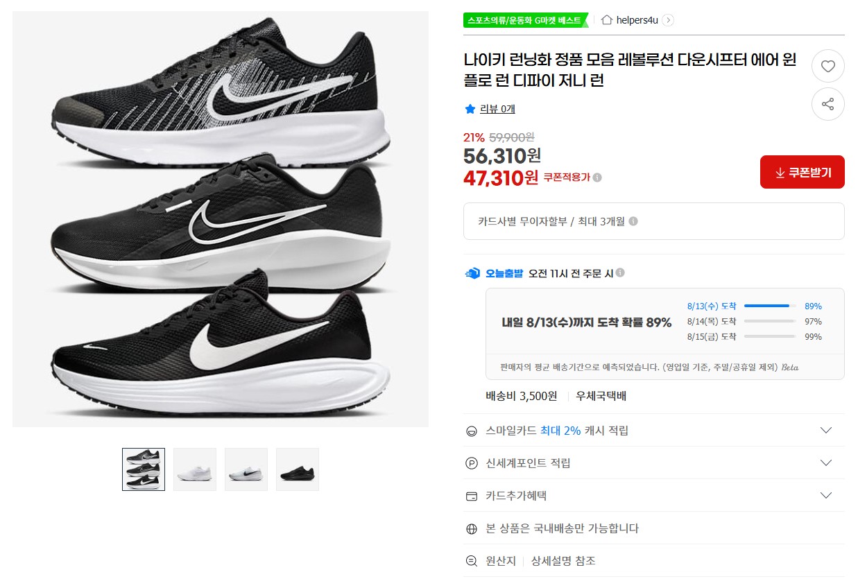 [지마켓] 나이키 런닝화 레볼루션 / 다운시프터 / 에어 / 윈플로 / 런 / 디파이 / 저니 / 런 (47,310원/3,500원) > 국내핫딜
