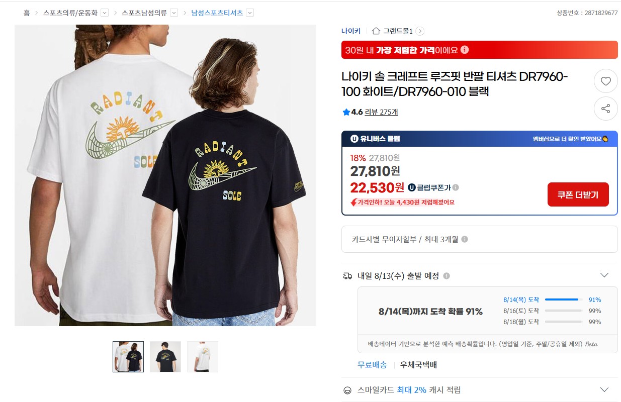 [지마켓] 나이키 솔 크레프트 루즈핏 반팔 티셔츠 DR7960-100 화이트/DR7960-010 블랙 (22,530원/무배) > 국내핫딜