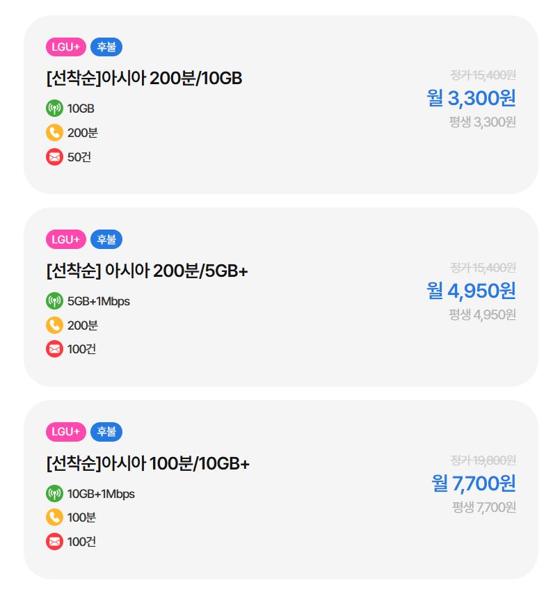 [아시아모바일] 알뜰폰특가 데이터 10GB (평생 3,300원) > 국내핫딜