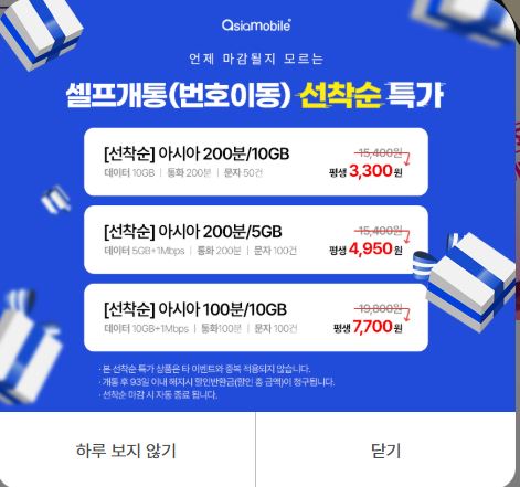아시아모바일 알뜰폰 특가입니다.