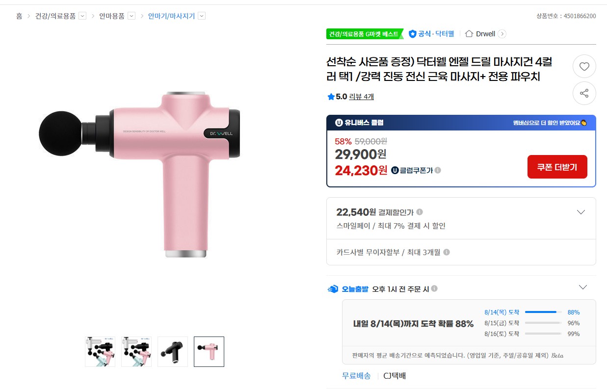 [지마켓] 닥터웰 엔젤 드릴 마사지건 4컬러 택1 (파우치 증정) 유클 24230원