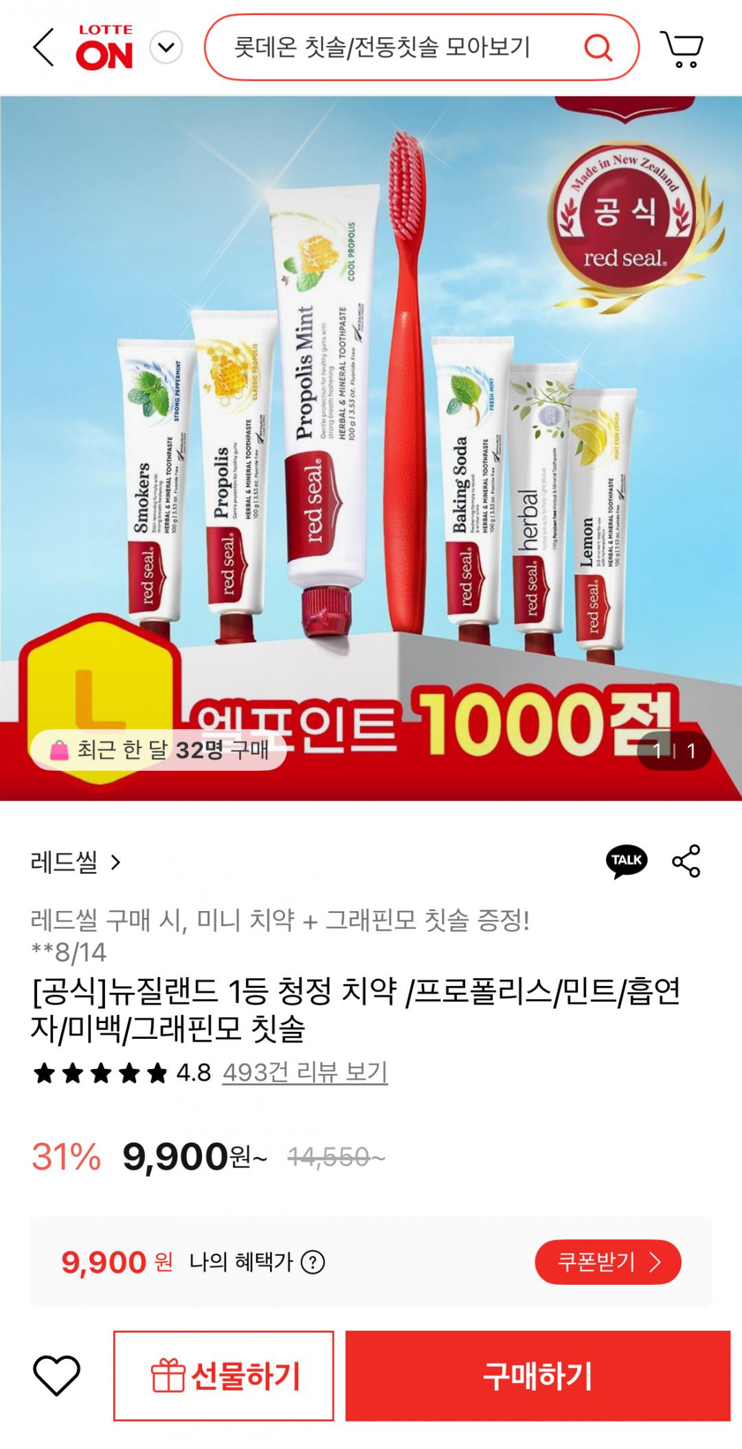 [롯데온] 레드씰 그래핀모칫솔 4개세트+미니치약 2개 증정 (9,900원/무료)