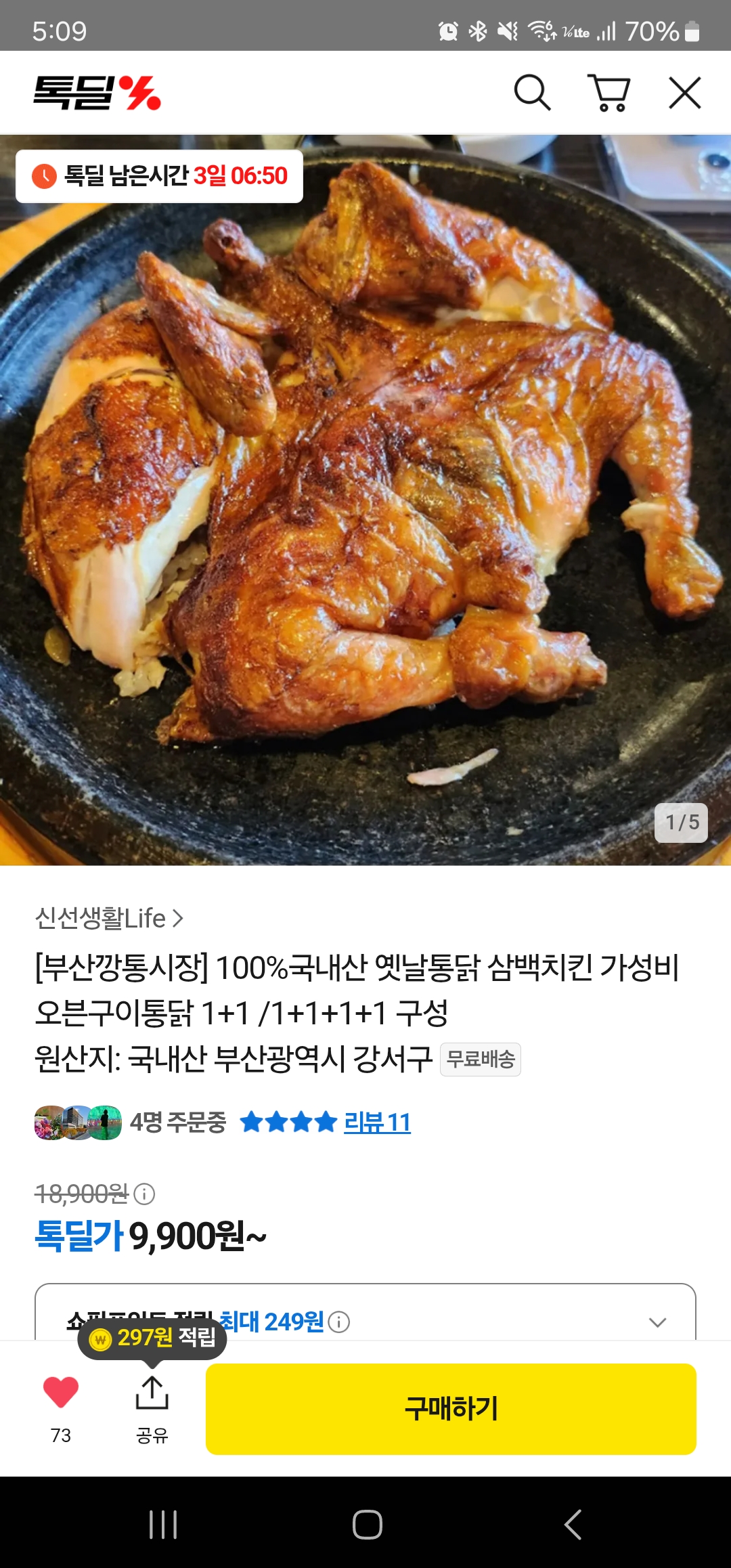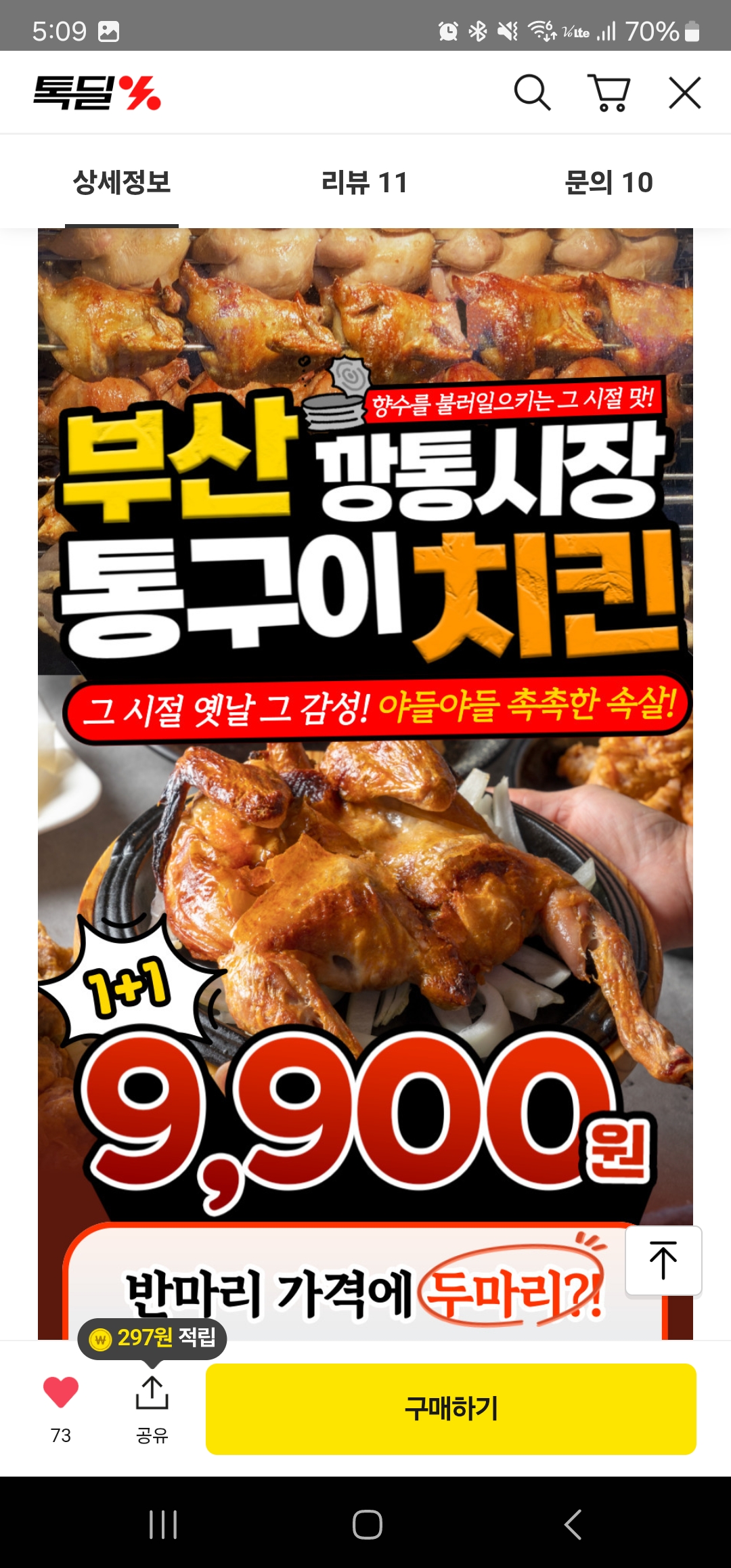 [톡딜] 국내산 오븐치킨 1+1 총 2마리 9,900원 무배 > 국내핫딜