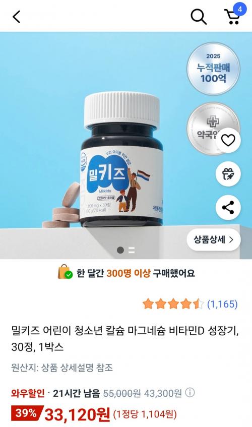 쿠팡) 밀키즈 키 성장 영양제 (33,120원/무배) > 국내핫딜