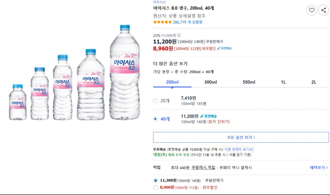 [쿠팡] 아이시스 8.0 생수, 200ml, 40개 (8,960원/무배)