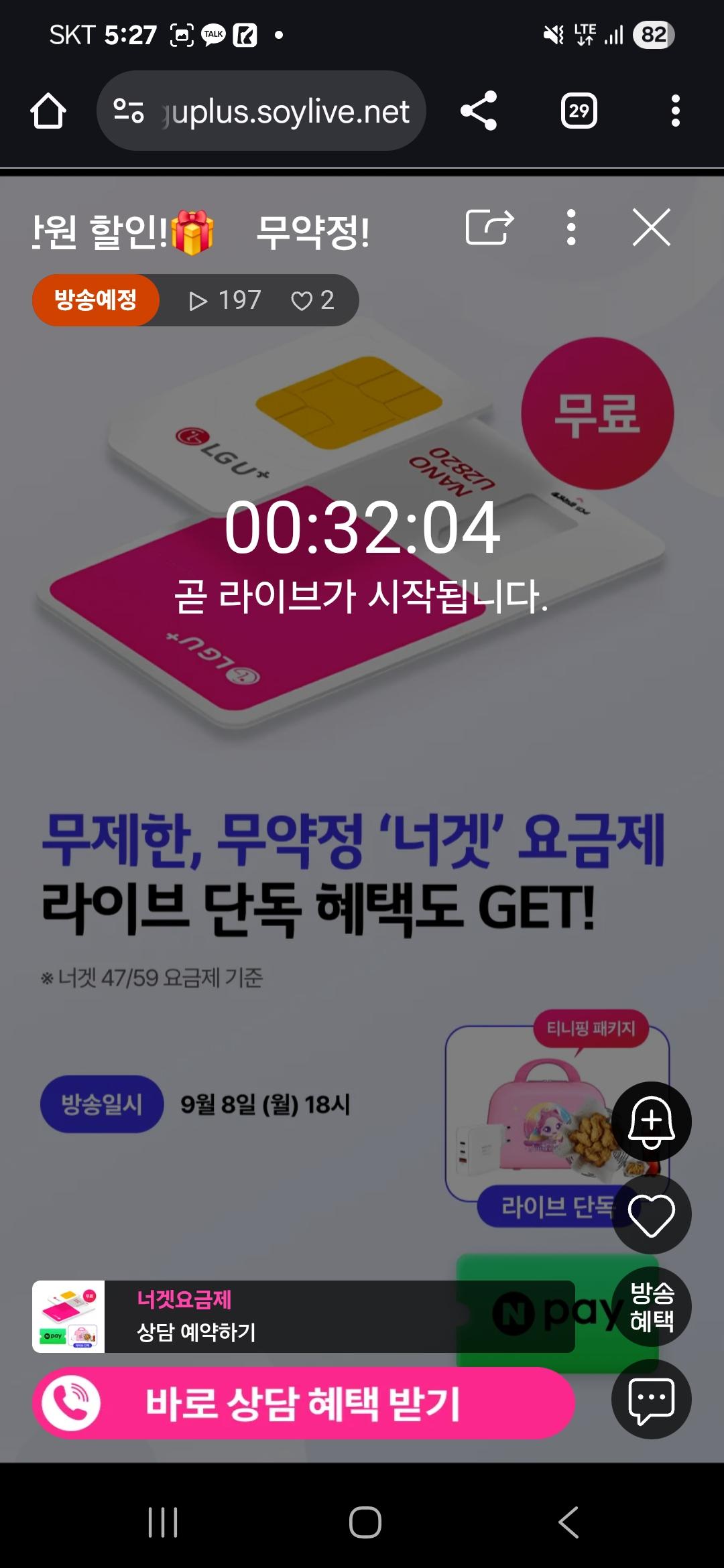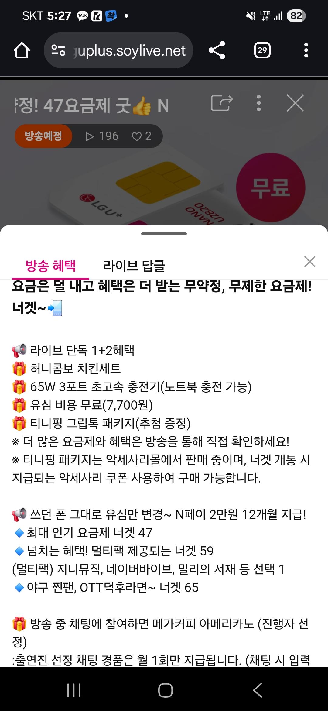 [U+] 너겟 요금제 라이브 유심비 무료, 충전기, 치킨 추가 지급 (월 47,000원/무료)