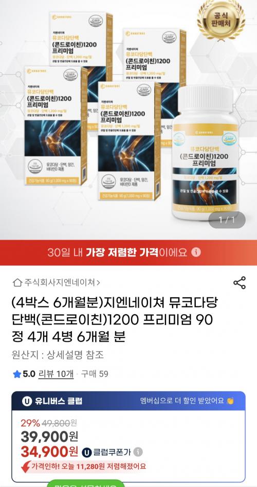 [지마켓] 뮤코다당단백 콘드로이친 1200 90정 4개 (유클34,900원/무료) > 국내핫딜