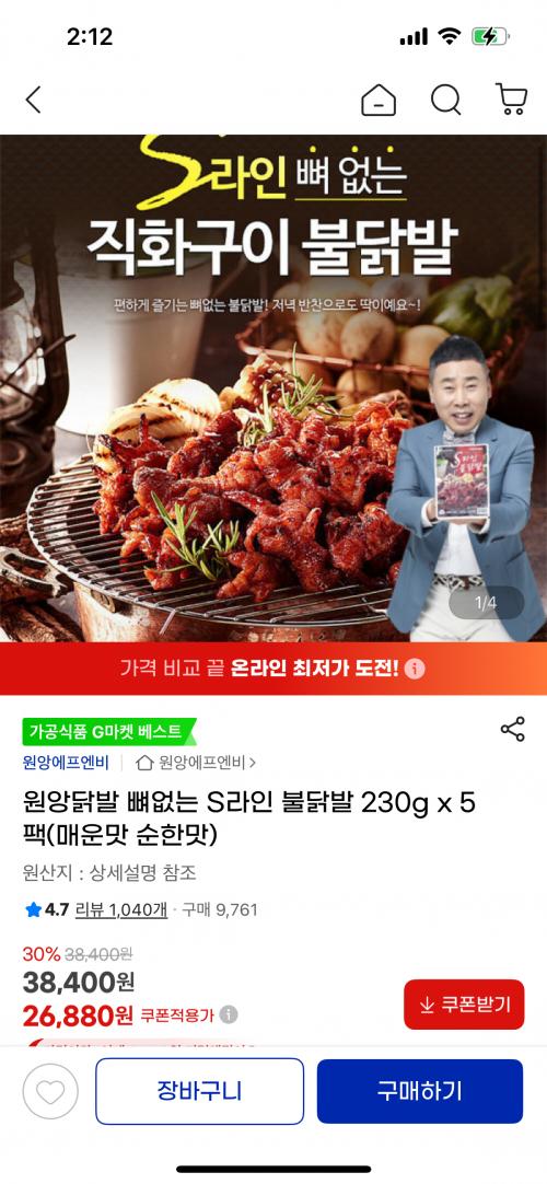 [지마켓] 뼈없는 불닭발 230g x 5팩 (매운맛 순한맛) (26,880원/무료) > 국내핫딜