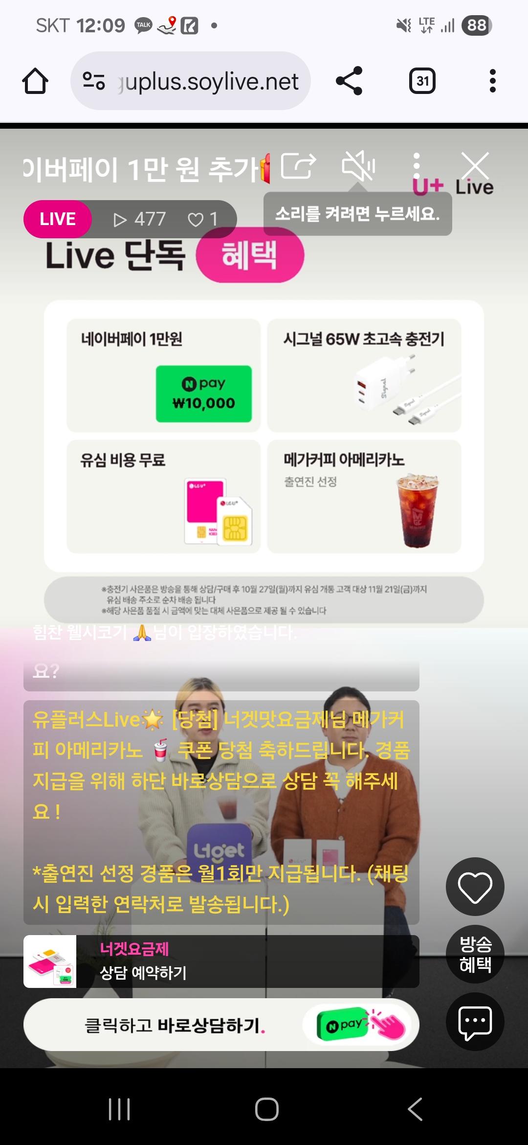 12시부터 라이브 하는데 유심비 무료에 네페 1만원, 충전기 줍니다.