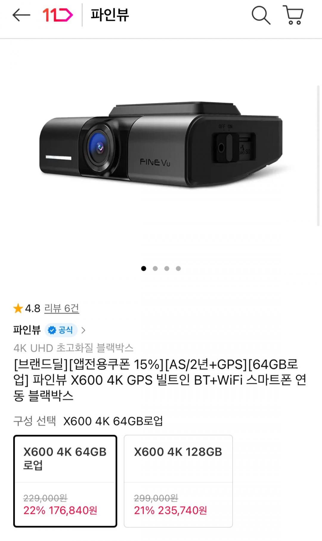 [11번가] 파인뷰 X600 4K GPS 블랙박스 (티멤 176,840원/무료)