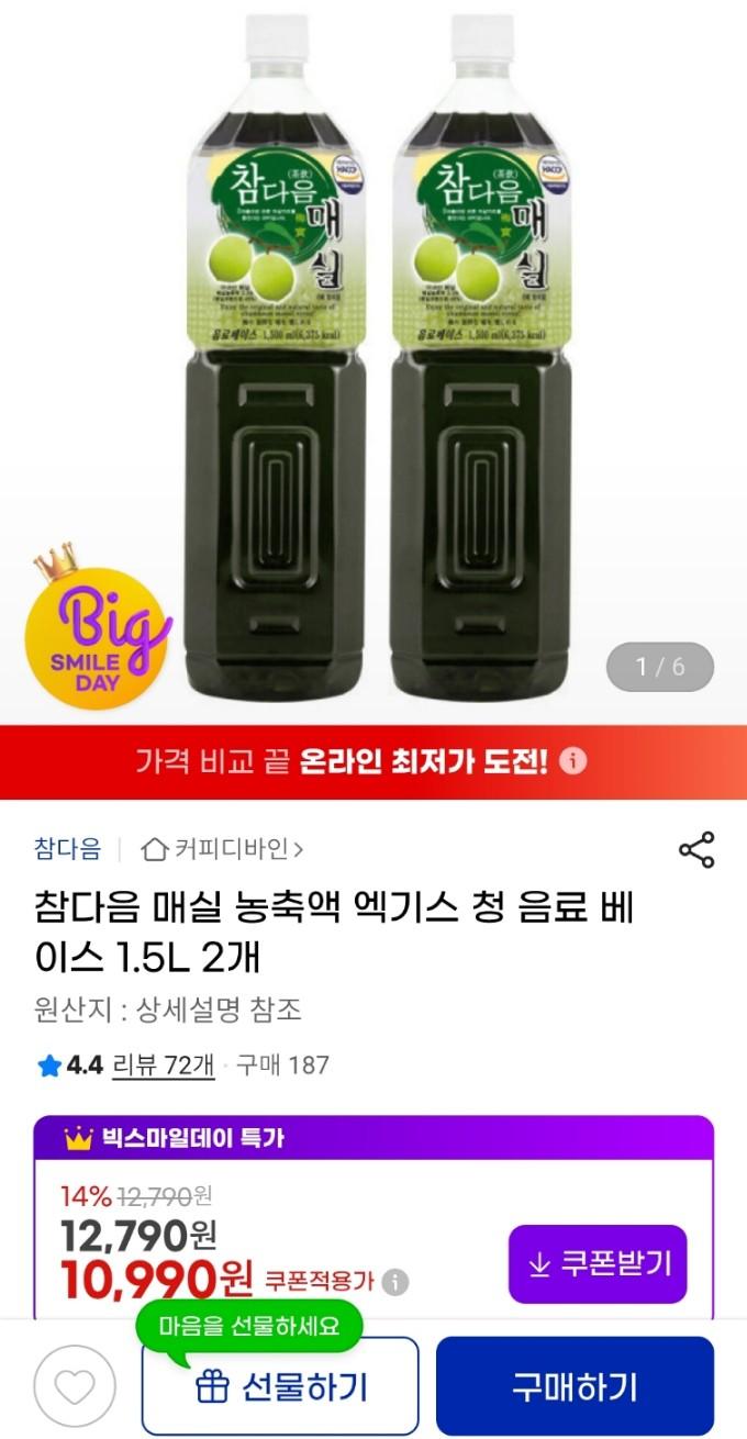 [지마켓] 참다음 매실 농축액 엑기스 청 음료 베이스 1.5L 2개 (10,990원/무료) > 국내핫딜