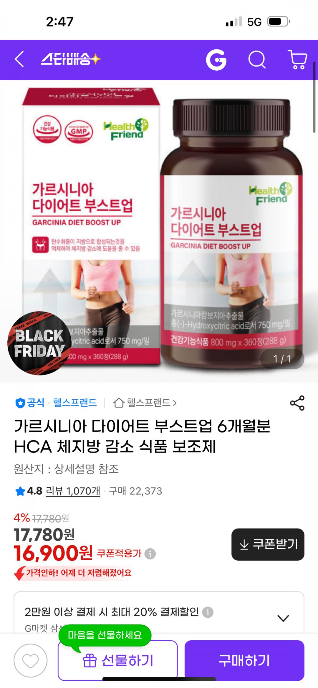 [지마켓] 가르시니아 다이어트 부스트업 6개월분 HCA 체지방감소 (16,900원/무료) > 국내핫딜