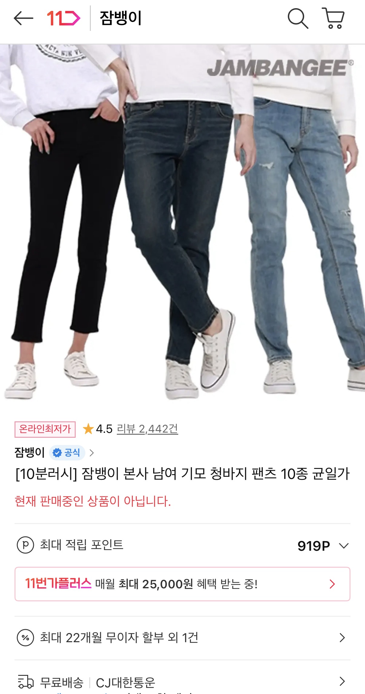 [11번가] (10분러시) 잠뱅이 기모 청바지 팬츠 10종 균일가 (12,500원/무료)