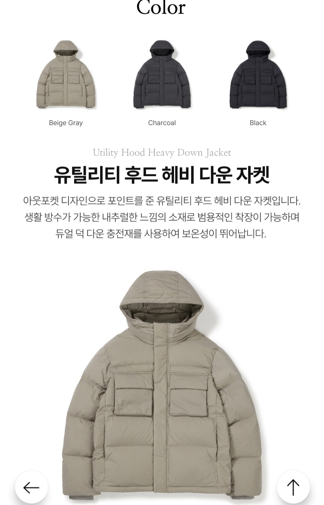 듀얼 덕 다운을 사용해서 보온성이 뛰어나다고 하네요.