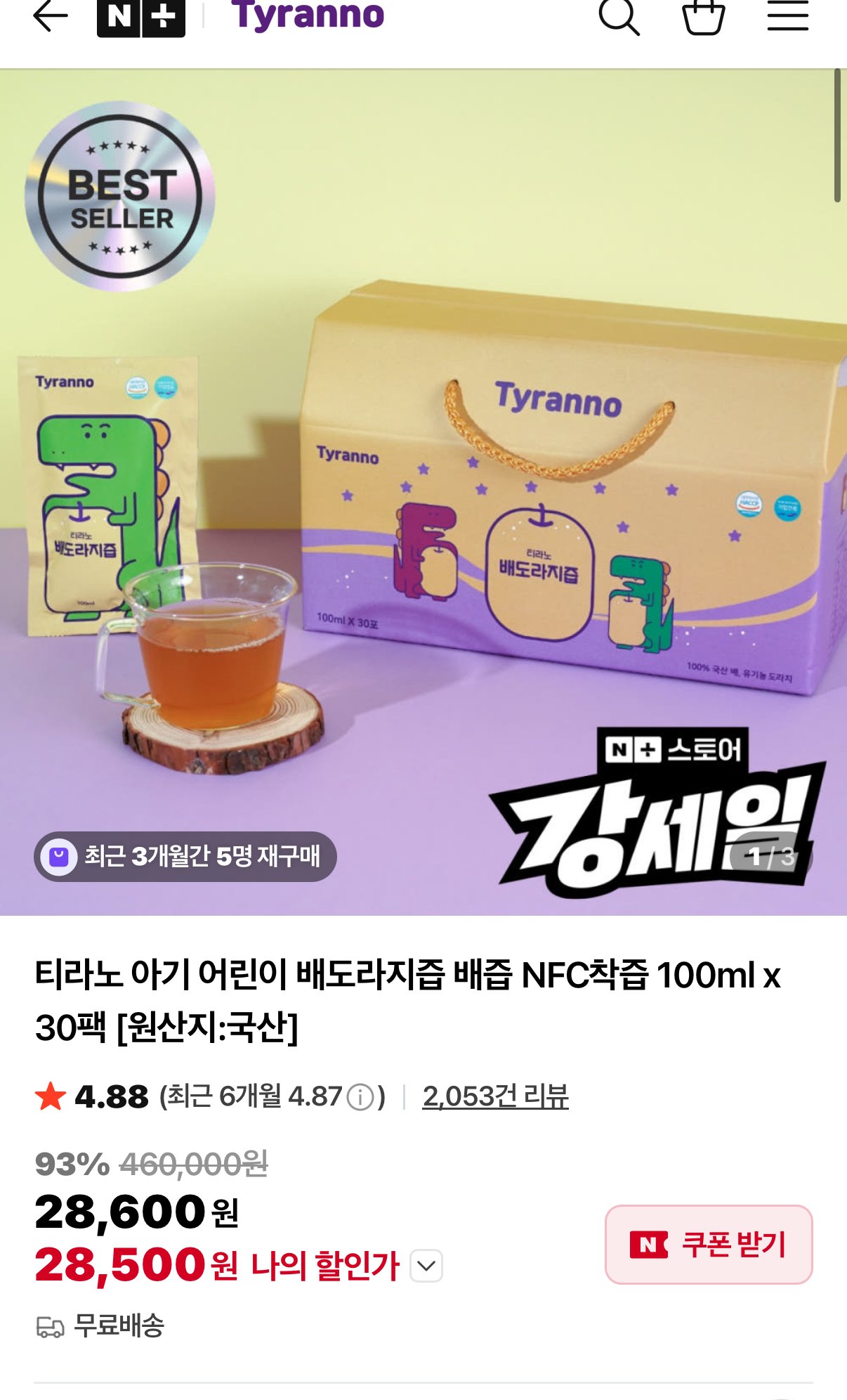 [네이버] 티라노 아기 어린이 배도라지즙 배즙 NFC착즙 100ml x 30팩 (28,600원/무배)