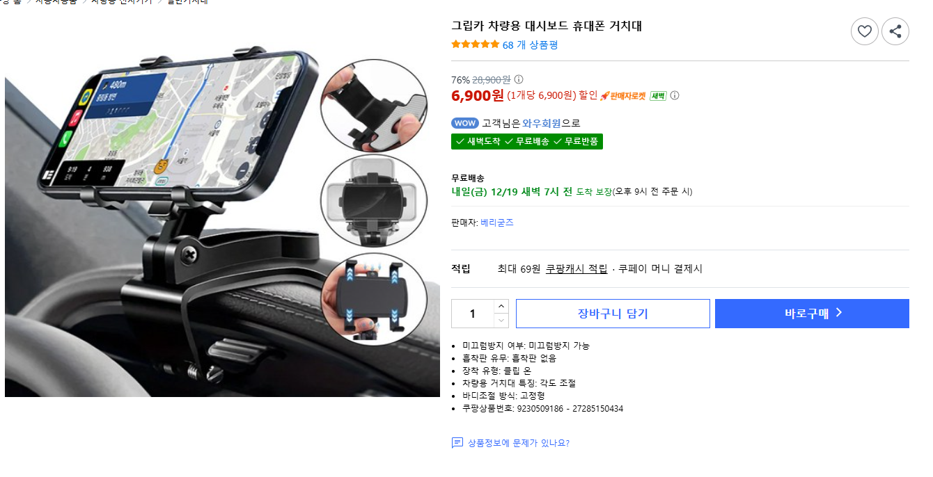 쿠팡)그립카 차량용 대시보드 휴대폰 거치대 6,900원 / 무배 > 국내핫딜
