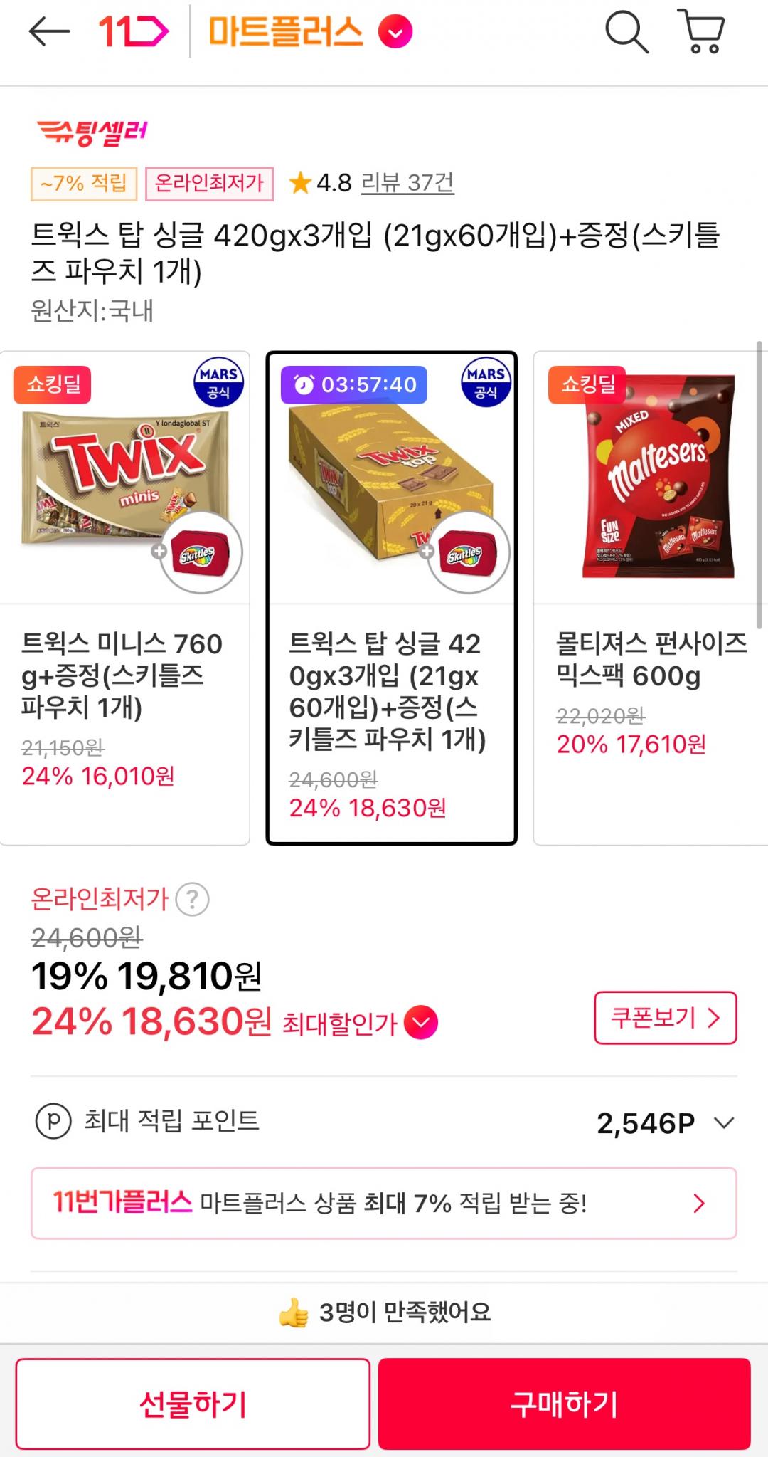 [11번가] 트윅스 탑 싱글 420g 3개입 (21g x 60개입) + 증정 (스키틀즈 파우치 1개) (19,810원/무료) > 국내핫딜
